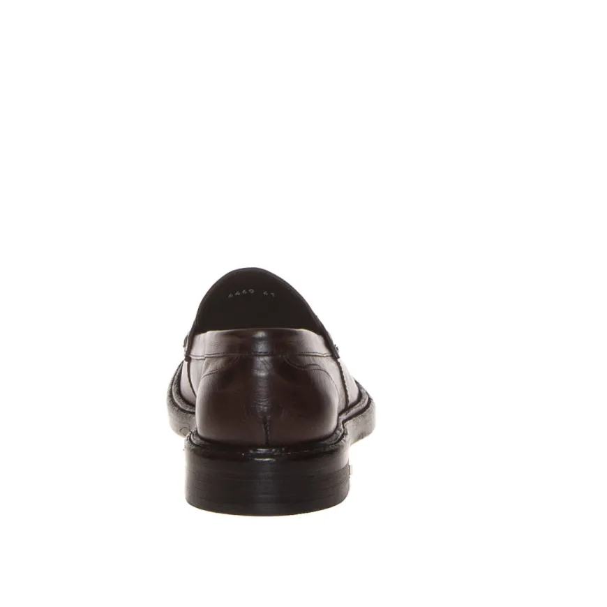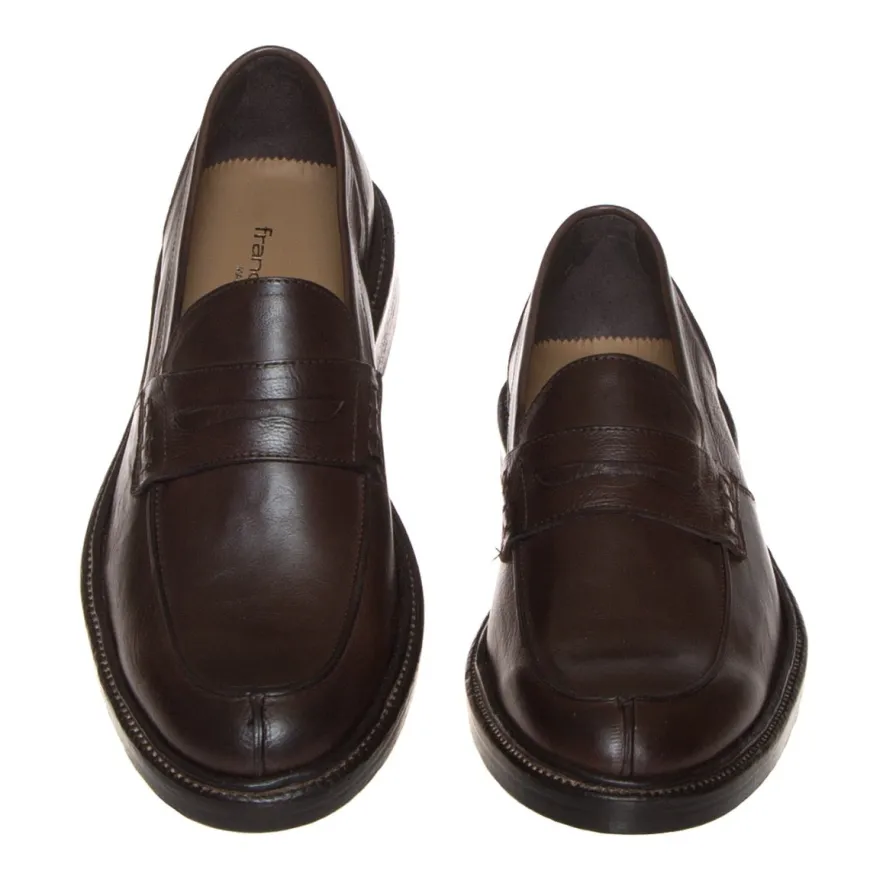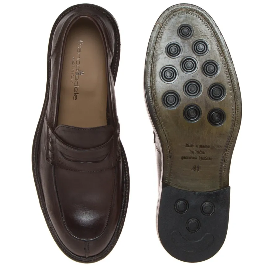 Mocassino college in pelle vitello marrone testa moro, lavorazione sfumata, di FRANCO FEDELE. Internamente foderato in pelle e con sottopiede in vero cuoio, Profilo-guardolo lavorato effetto vintage, suola in cuoio cucita, battistrada con bollini in gomma antiscivolo. Tacco altezza 3 cm.