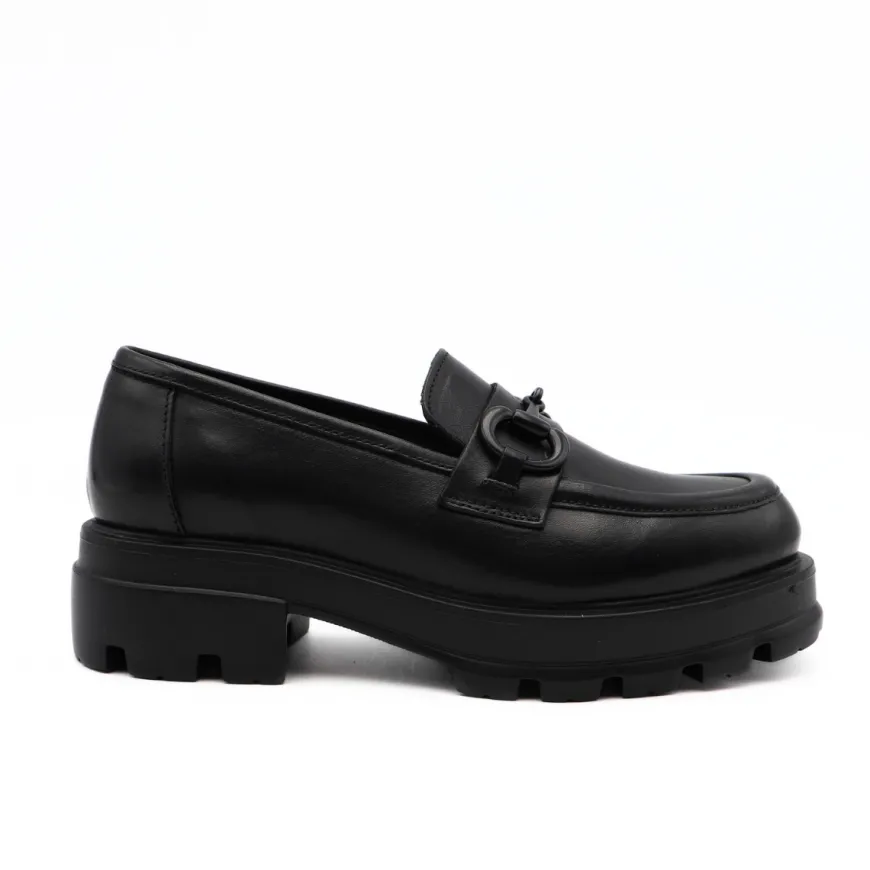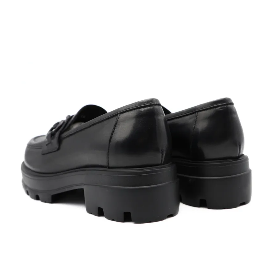 Mocassino da donna di FRANCO FEDELE. Tomaia in pelle nera, decorata con morsetto. Internamente foderata e sottopiede in pelle. Suola in gomma carrarmato extralight, tacco esterno 4 cm.