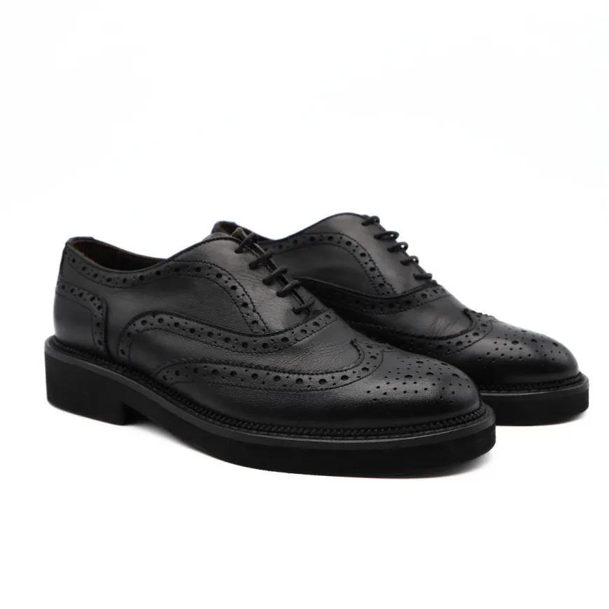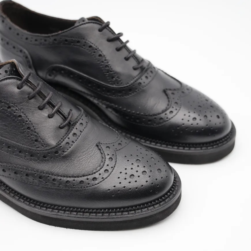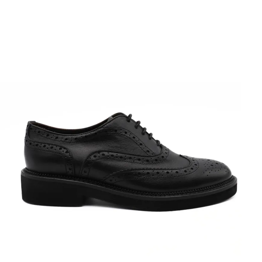 Stringata inglese da donna di FRANCO FEDELE. Tomaia in pelle nera, decorata con puntale a coda di rondine. Internamente foderata e sottopiede in pelle. Suola in gomma extralight, tacco esterno 3.5 cm.