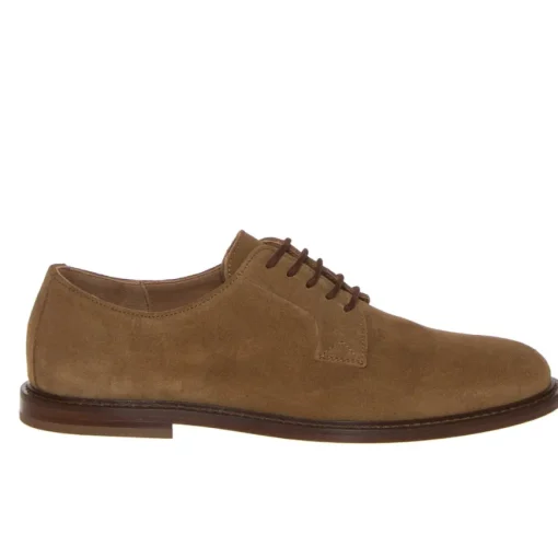 Leggera stringata derbi uomo, di FRAU, tomaia in morbido camoscio marrone bruciato cognac, internamente sfoderata con morbido sottopiede in appoggio. Suola in cuoio, massima flessibilità data dalla suola cucita direttamente alla suola, lavorazione ideal; tacco 1.5 cm. Calzatura con calzata comoda; ideata, disegnata e realizzata in Italia, prodotto made in Italy.