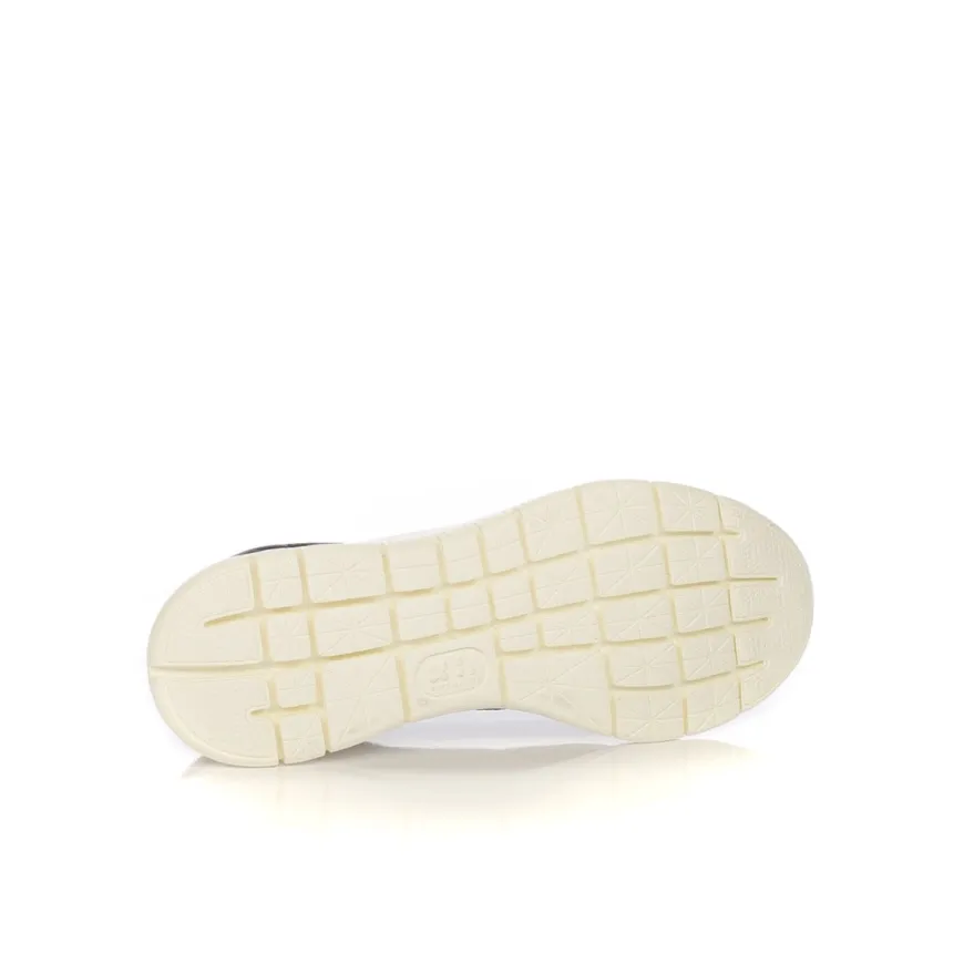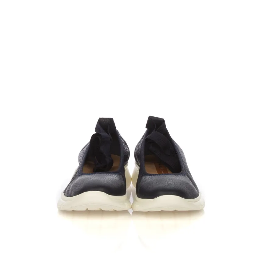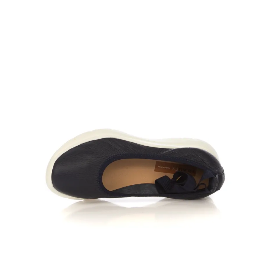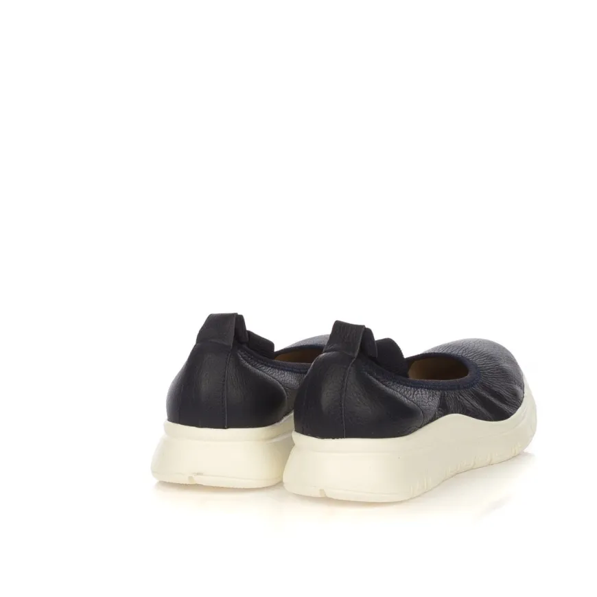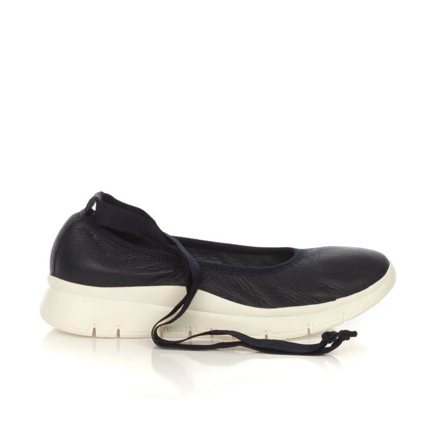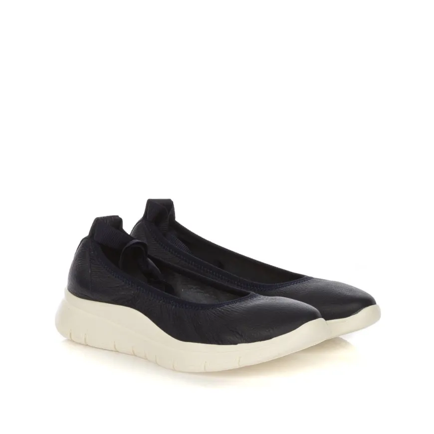 Ballerina da donna di FRAU. Tomaia in pelle color blu. Collarino in tessuto e laccio alla caviglia in tessuto elastico. Interno e sottopiede rivestito in pelle. Suola in gomma leggera bianca.