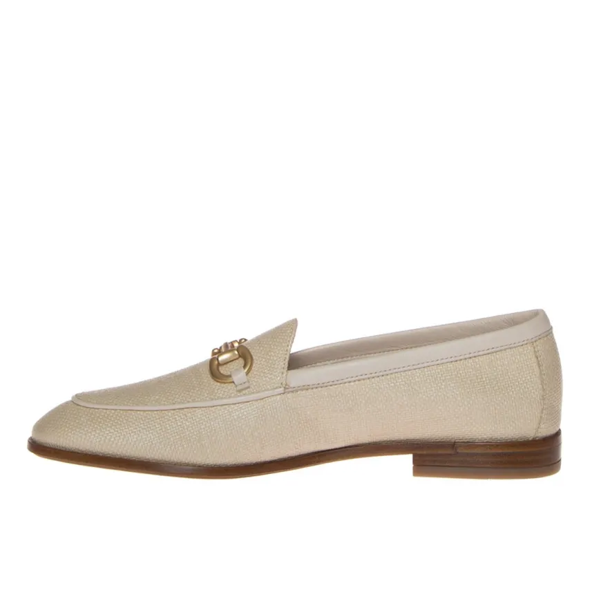 Mocassino donna di FRAU. Tomaia realizzata in raffia e pelle panna con morsetto in metallo dorato. Interno e sottopiede foderati in pelle. Suola in gomma.