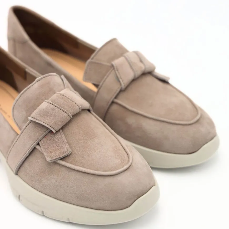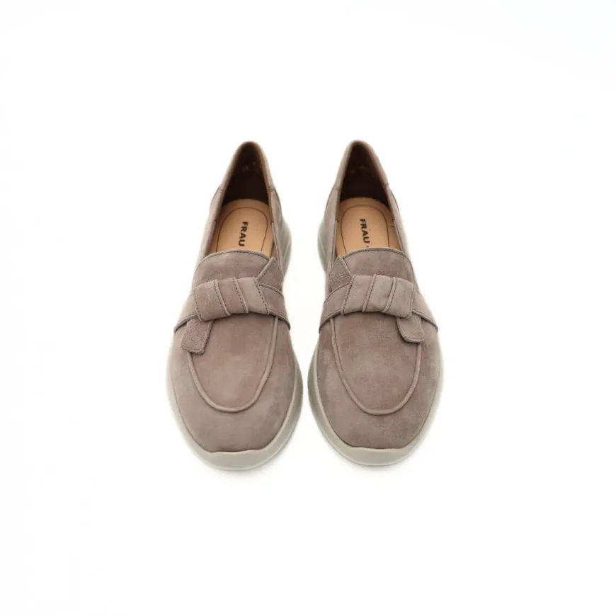 Slip on da donna di FRAU, realizzata in pelle scamosciata taupe con treccia sul morsetto. Interno sfoderato e sottopiede in tessuto. Suola in gomma leggera.