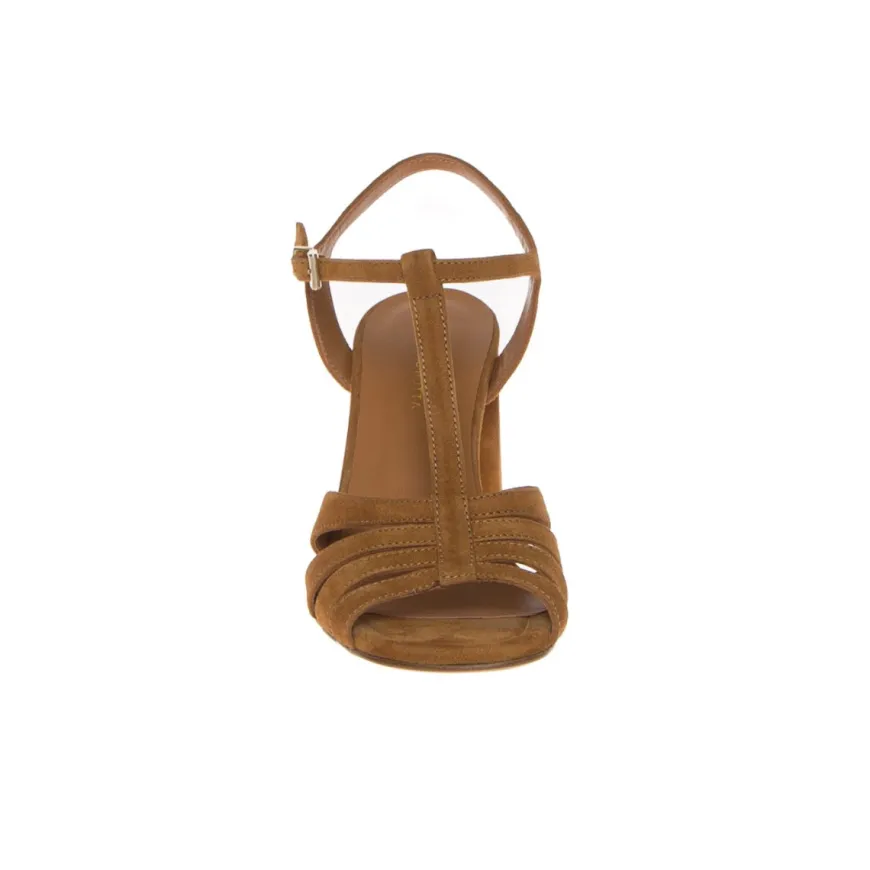 Sandalo donna elegante in morbida pelle “rovesciata” scamosciata marrone whisky, di GUGLIELMO ROTTA. Internamente foderato, e nel sottopiede costruito con morbido cuscinetto, rifinito in pelle e impunture. Tacco largo rivestito, altezza 10 cm, leggero plateau interno 1 cm, suola in cuoio; chiusura con cinturino in caviglia. Prodotto ideato, disegnato e realizzato in Italia, calzatura made in Italy.