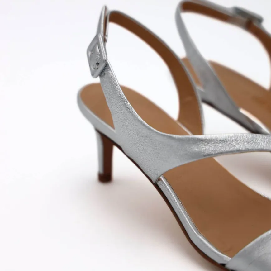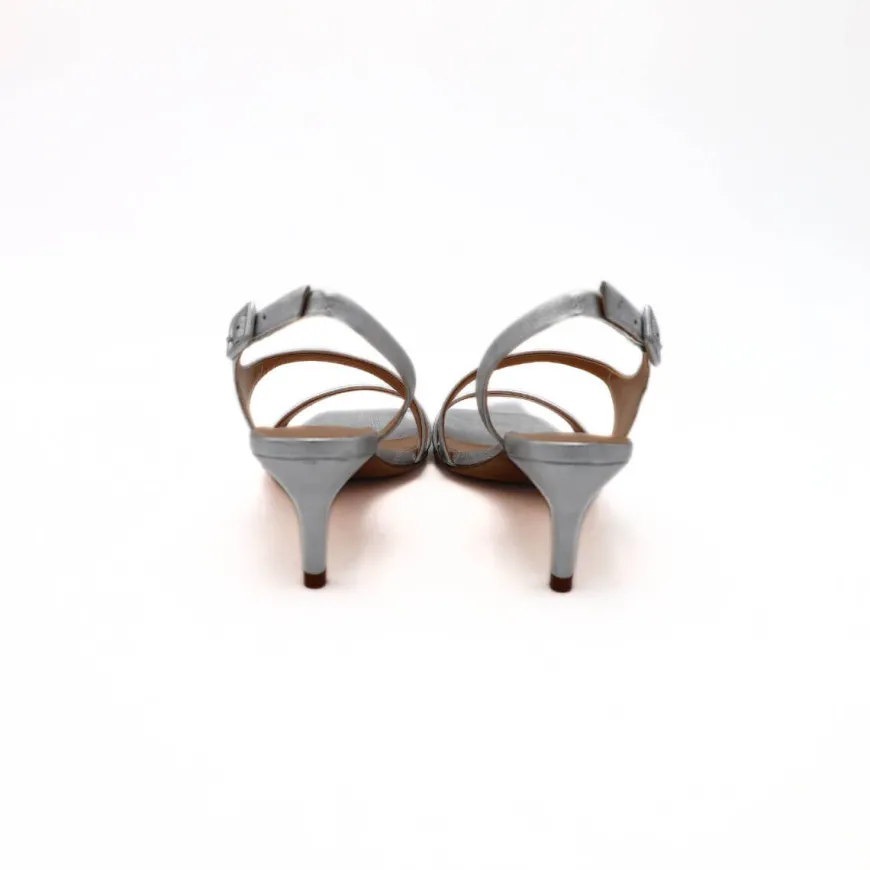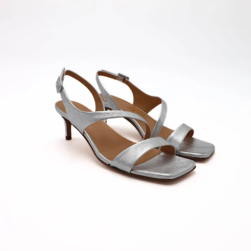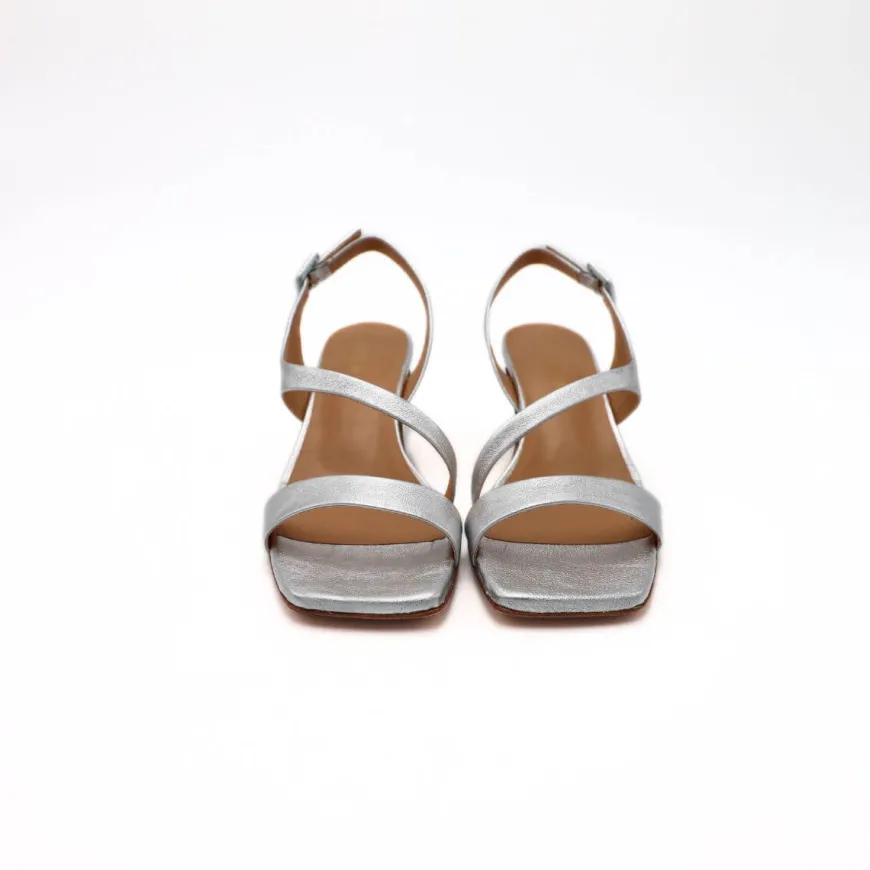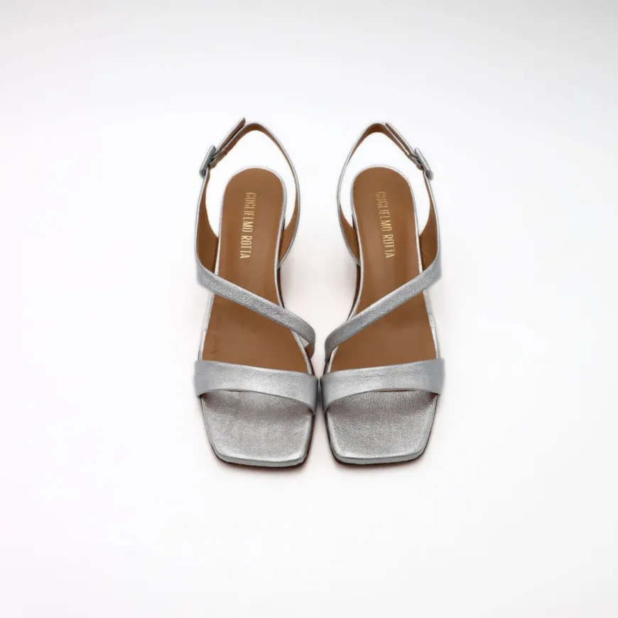 Sandalo elegante di GUGLIELMO ROTTA. Realizzato in pelle argentata, con cinturino regolabile alla caviglia. Internamente foderata in pelle, cuscinetto morbido nel sottopiede, rifinito in pelle. Suola in cuoio e tacco di 5,5 cm.