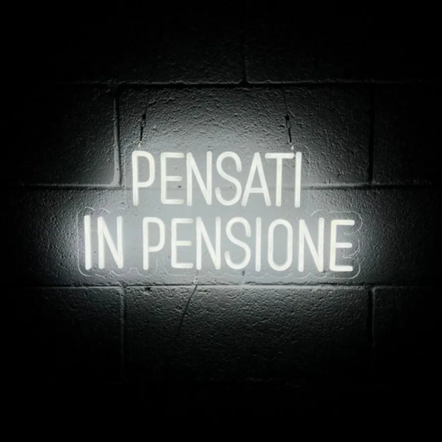 Scritta led che recita “PENSATI IN PENSIONE“