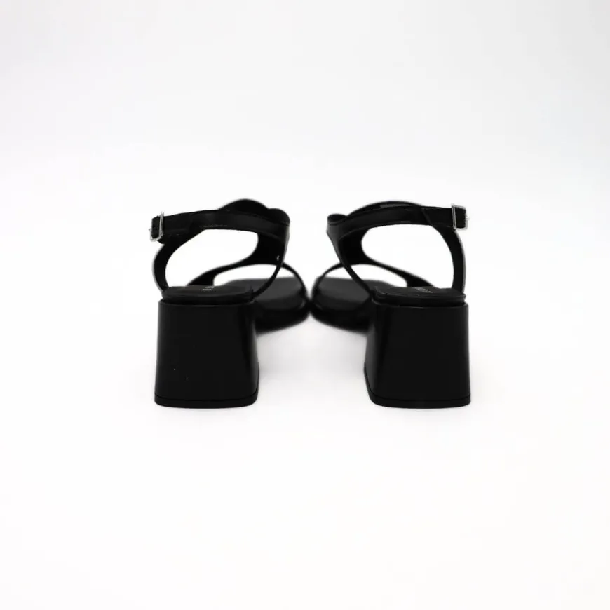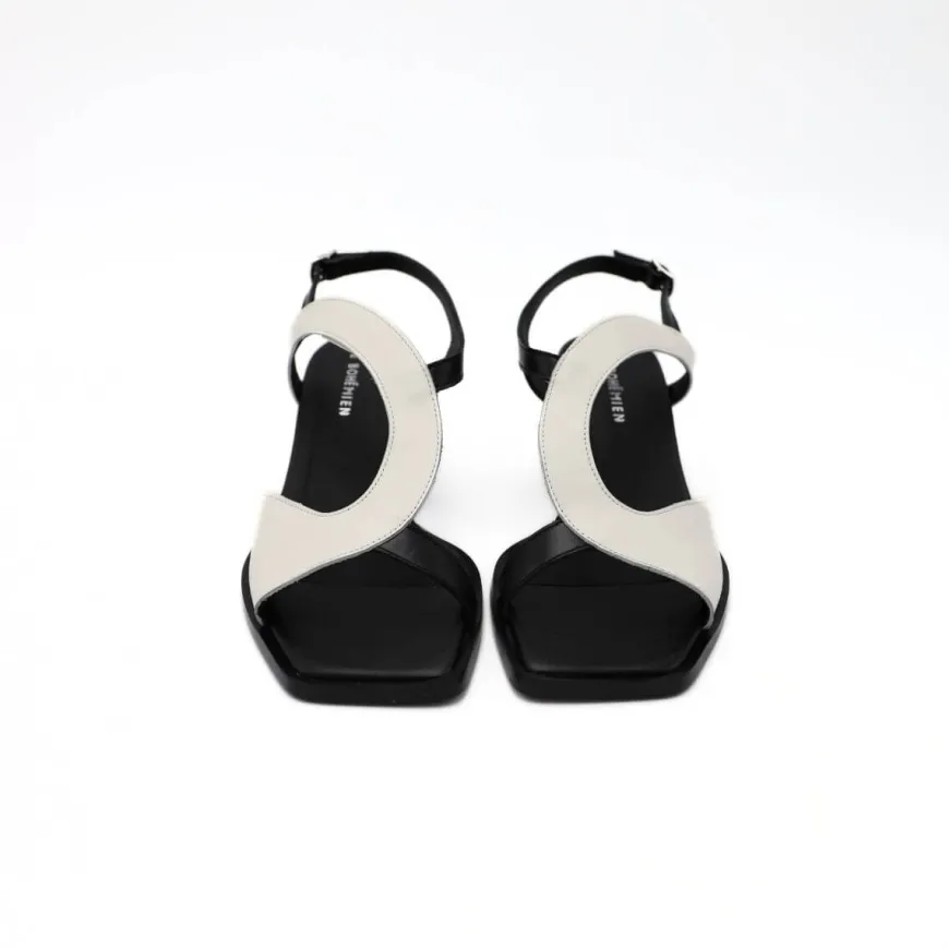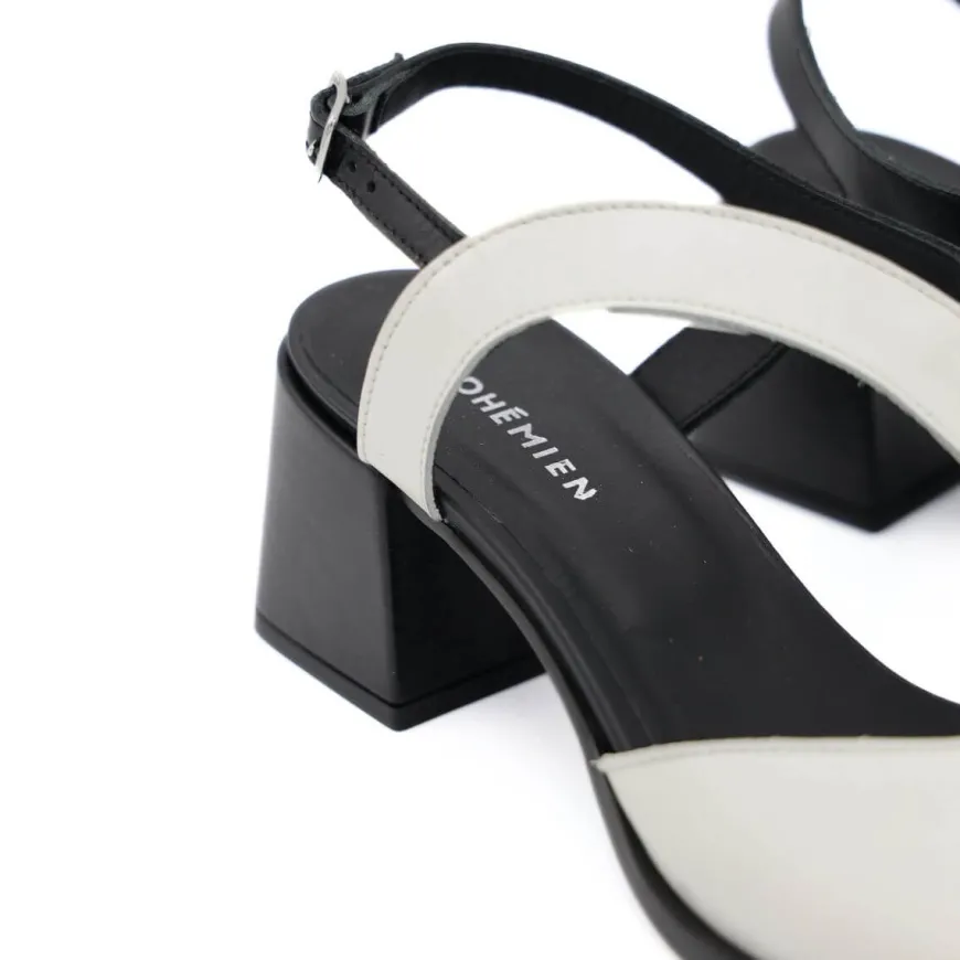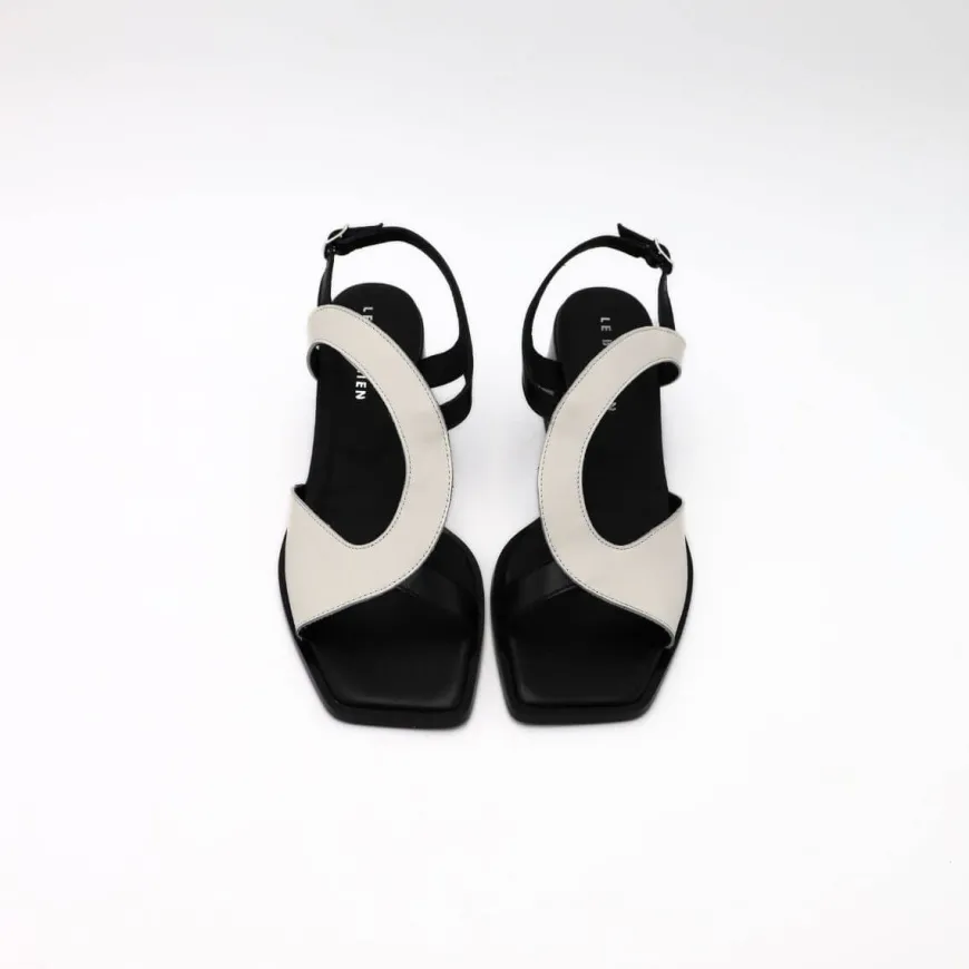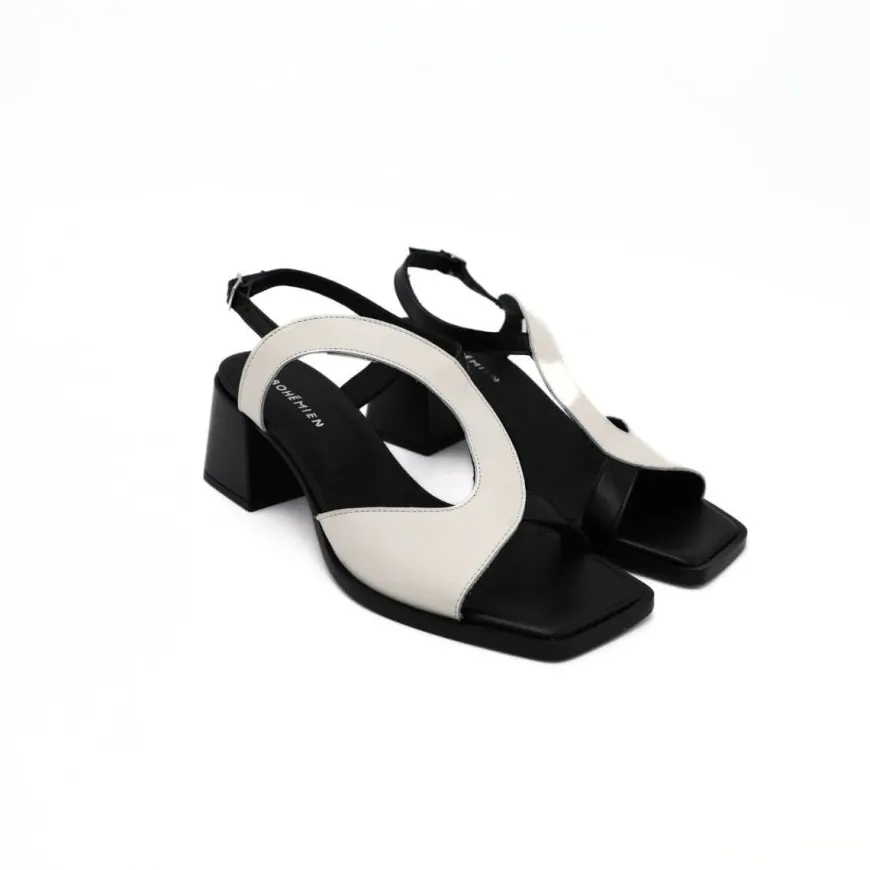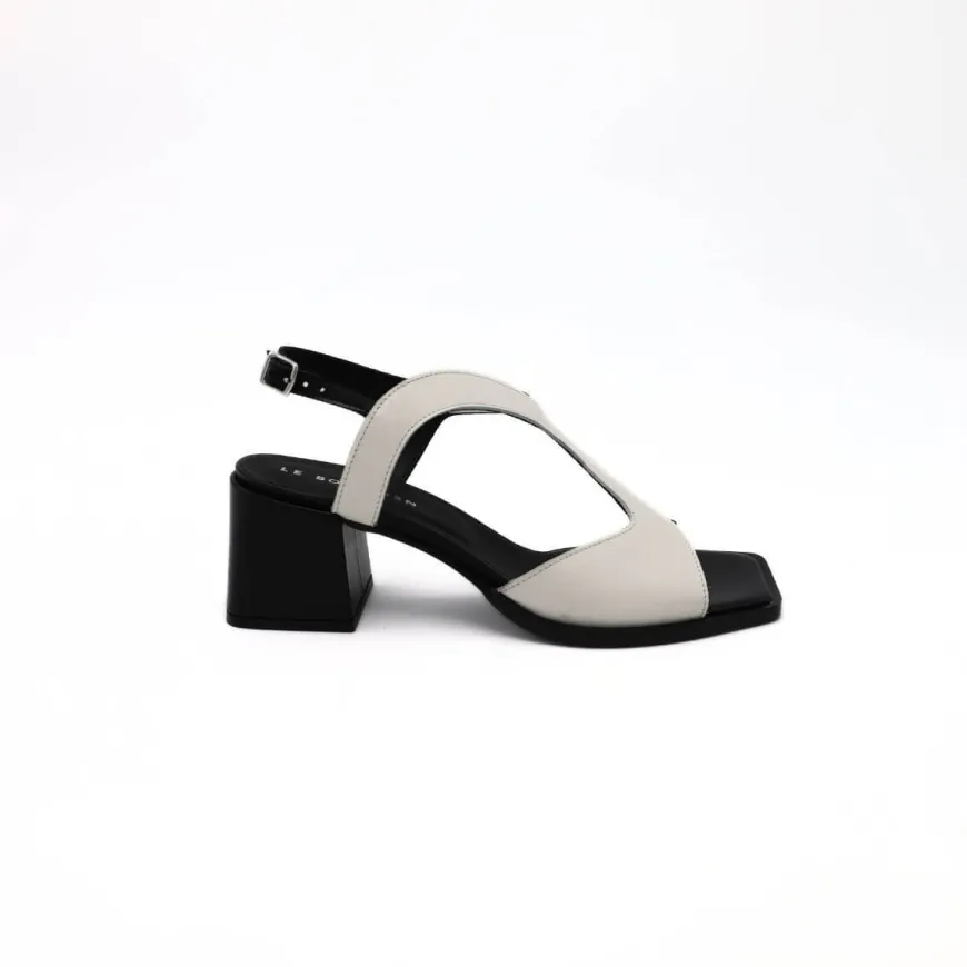 Sandalo alto da donna di LE BOHÉMIEN. Tomaia realizzata in pelle bianca e nera, realizzata con incroci. Chiusura con cinturino regolabile sulla caviglia. Foderato internamente in pelle. Suola in gomma. Altezza tacco: 6cm