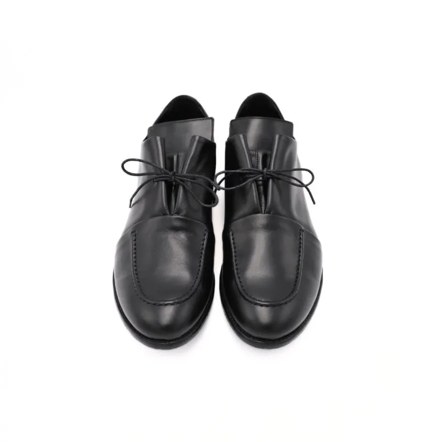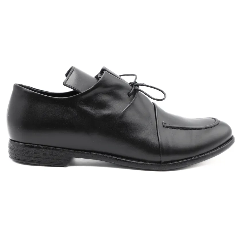Scarpa, elegante, stringata da uomo di LE BOHÈMIEN. Tomaia realizzata in pelle nera, con cuciture a vista sul puntale. Interno foderato e sottopiede in pelle. Suola in cuoio. Chiusura con laccio fino.