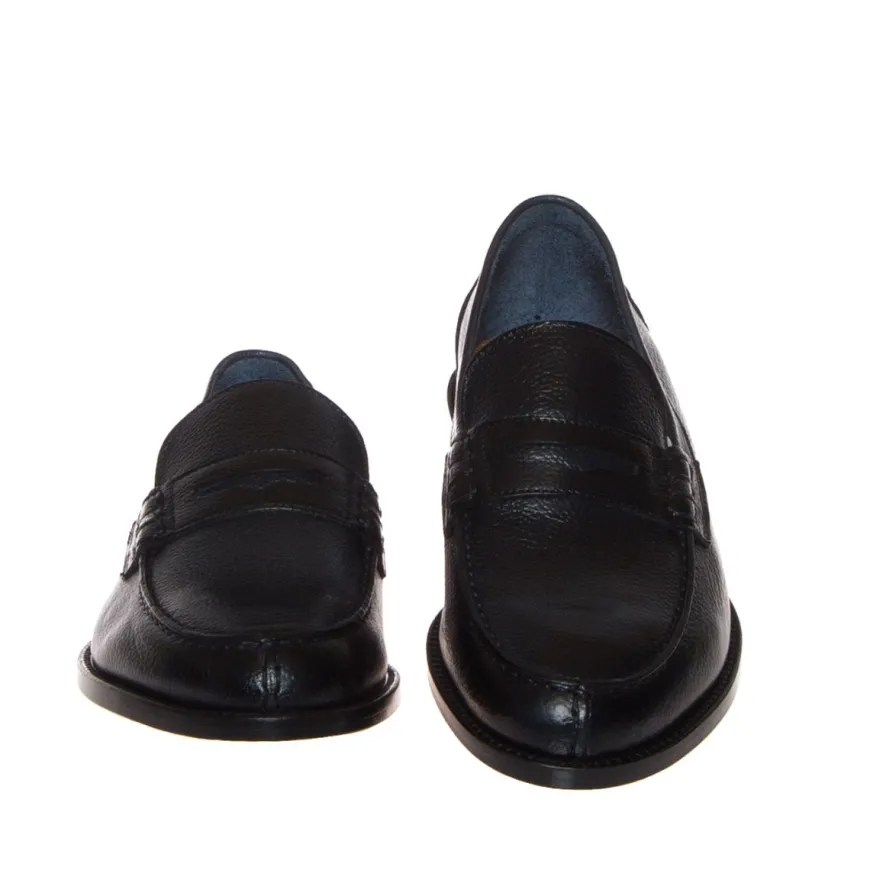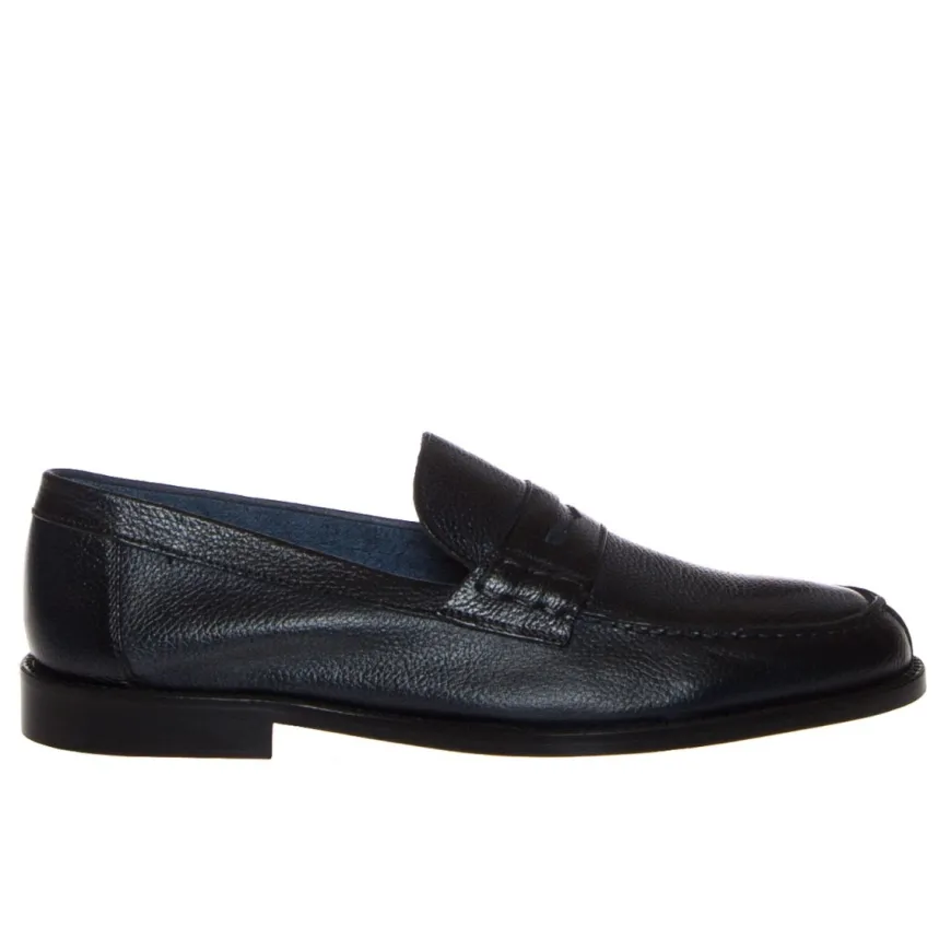 Mocassino college sfoderato in morbida pelle bottalata blu con lavorazione spazzolata di Lendini. Internamente con sottopiede in pelle, suola in cuoio naturale.