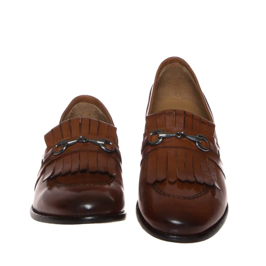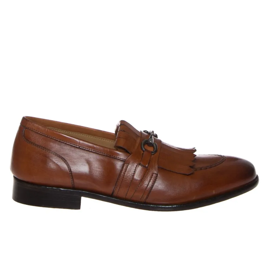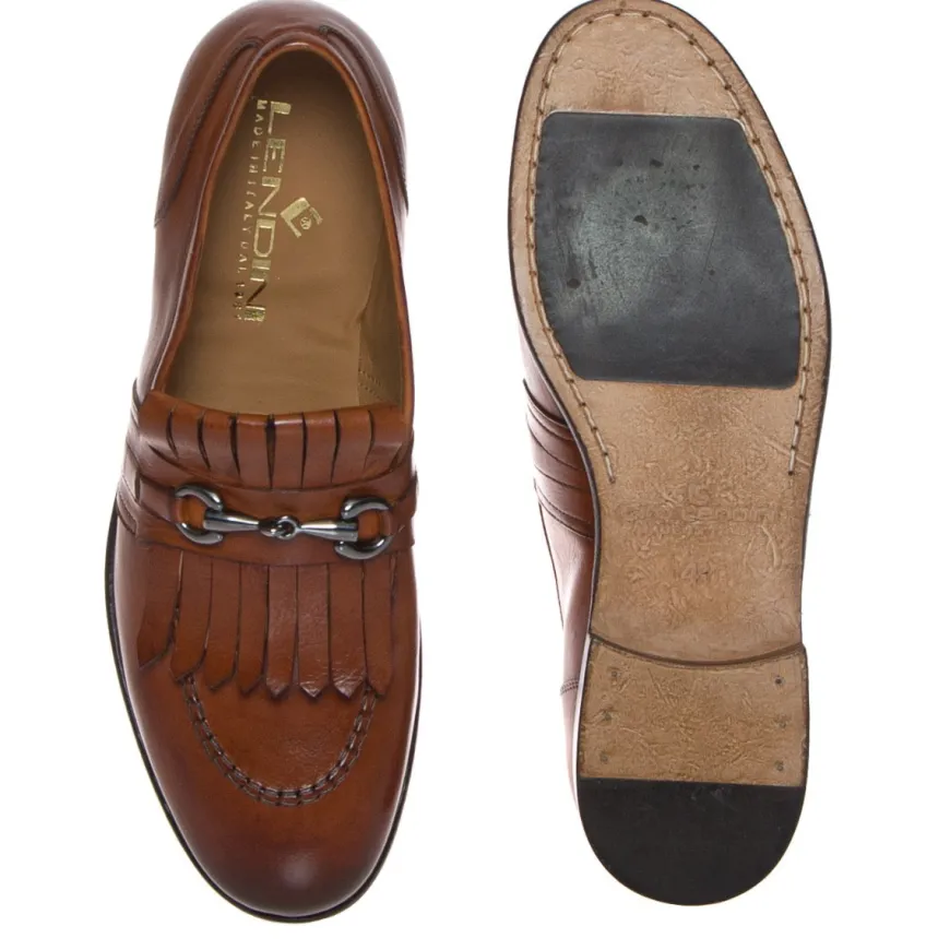 Mocassino retrò con frangie e morsetto di Lendini, in pelle spazzolata colore marrone cuoio. Internamente foderato e con sottopiede in pelle. Suola in cuoio cucita, con inserto antiscivolo in gomma.