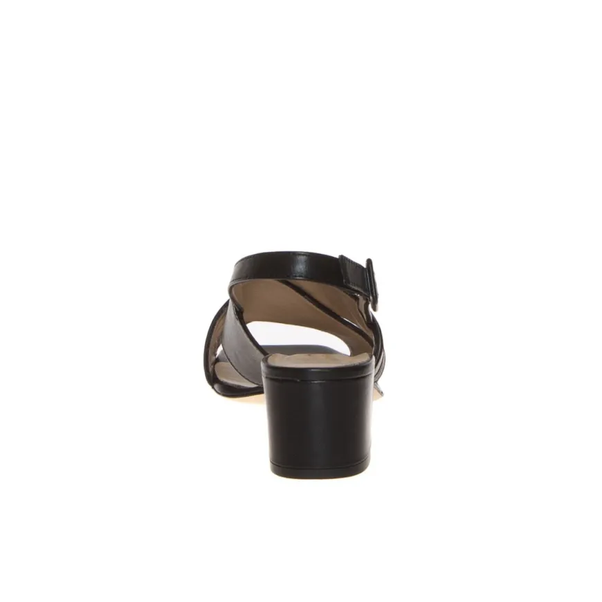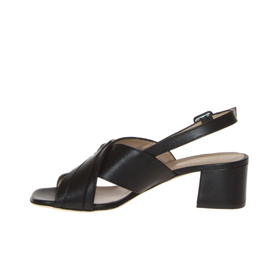 Sandalo elegante in pelle nappata nero, con accessorio dorato di LUCA GROSSI. Morbide fascie incrociate nella pianta, posteriormente chiuse con fibbietta rivestita, con elastico autoregolante. Internamente morbido sottopiede rifinito in pelle. Suola in cuoio, tacco largo rivestito 5.5 cm. Calzatura con vestibilità comoda; ideata, disegnata e realizzata in Italia, prodotto made in Italy.