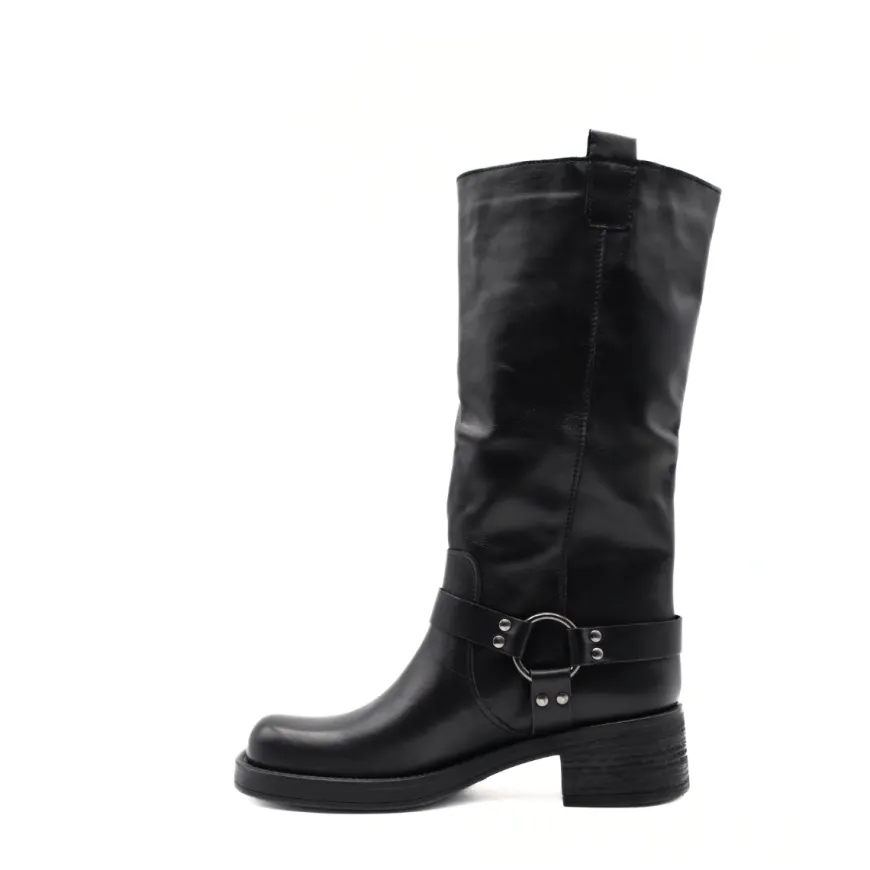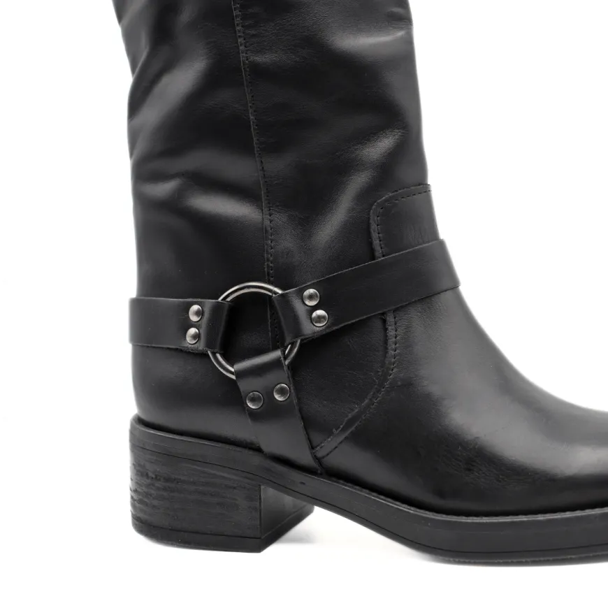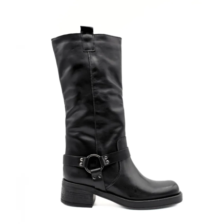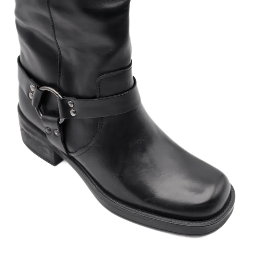 Stivale alto, camperos, da donna di MAD MIND. Realizzato in pelle nera con fibbie sulla caviglia e punta arrotondata. Suola in gomma.