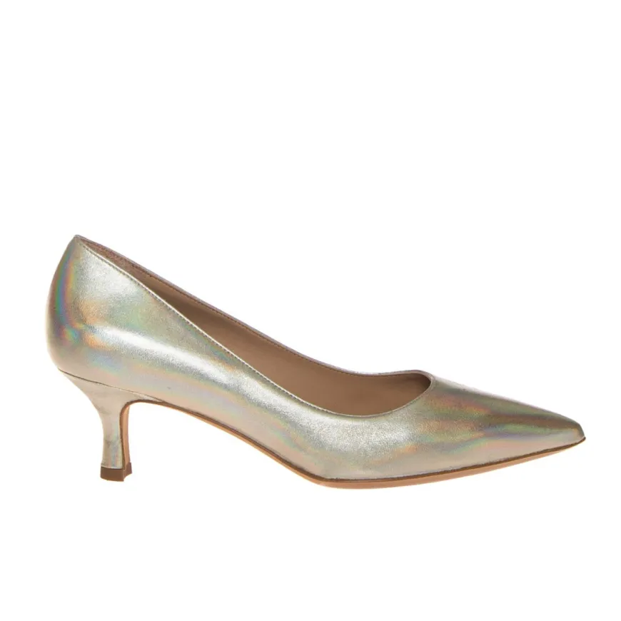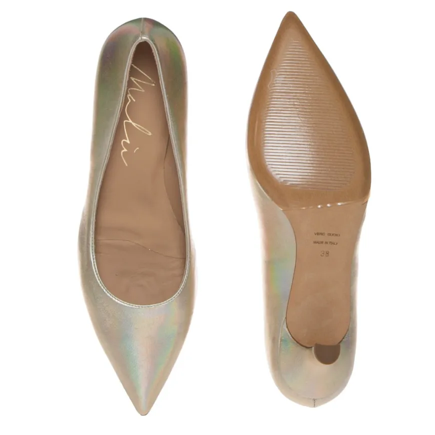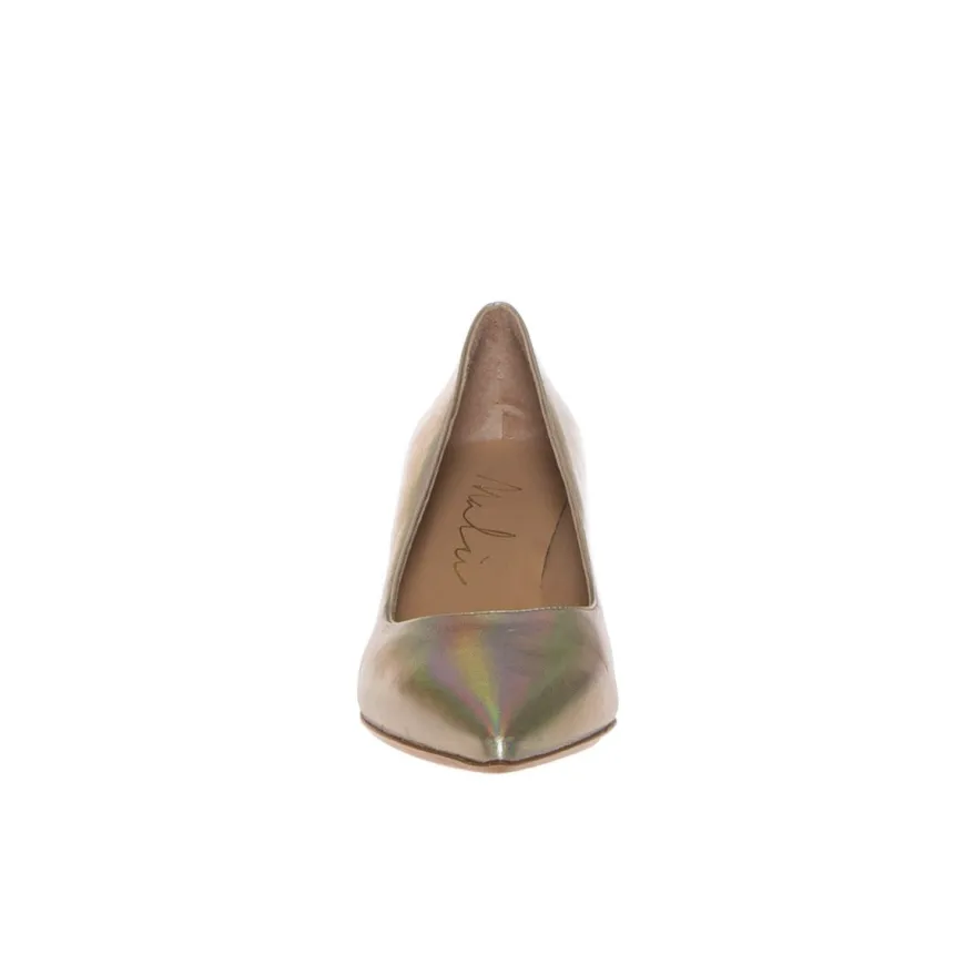 Dècolletè da donna di MALÙ. Tomaia realizzata in pelle color platino/oro iridescente. Interno e sottopiede foderato in pelle. Suola in cuoio, tacco a rocchetto rivestito (6 cm).