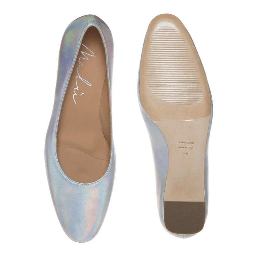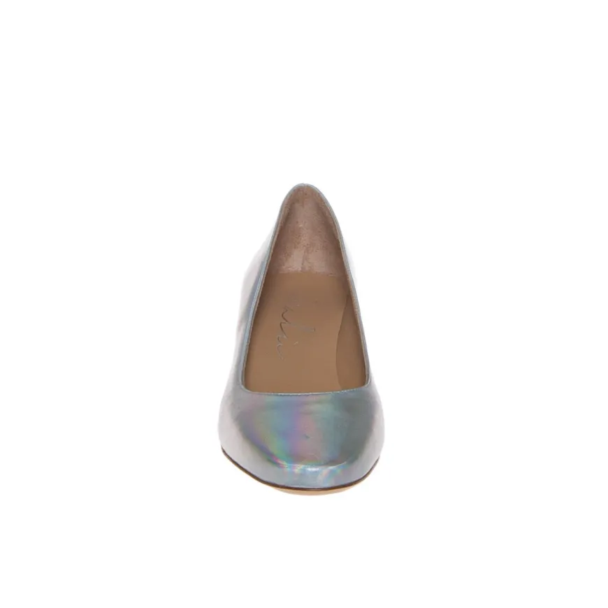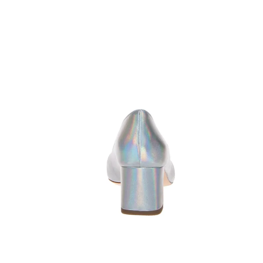 Elegante dècolletè donna di MALÙ, realizzata in pelle laminata argento con tacco largo. Interno e sottopiede imbottito foderato in pelle. Tacco rivestito in pelle e suola in cuoio. MADE IN ITALY