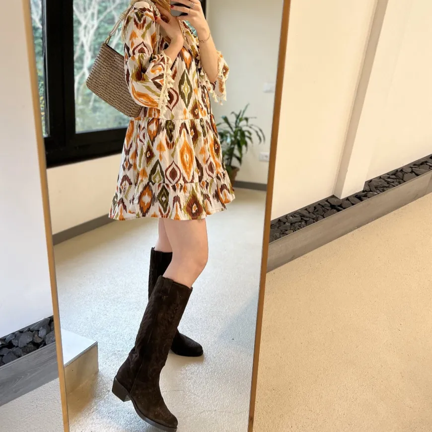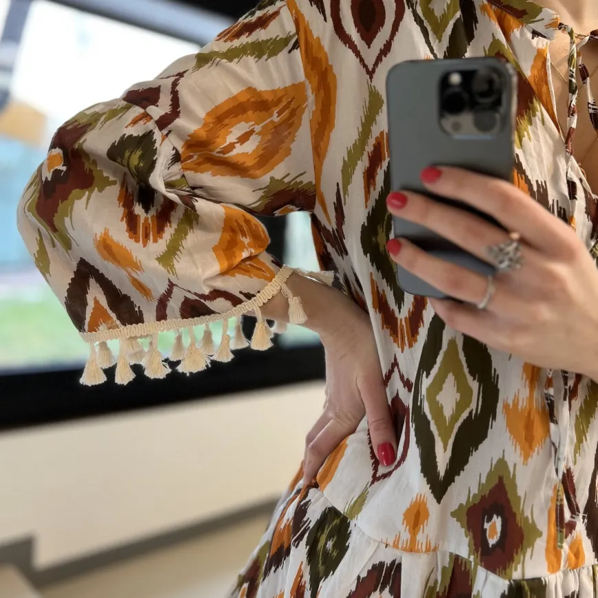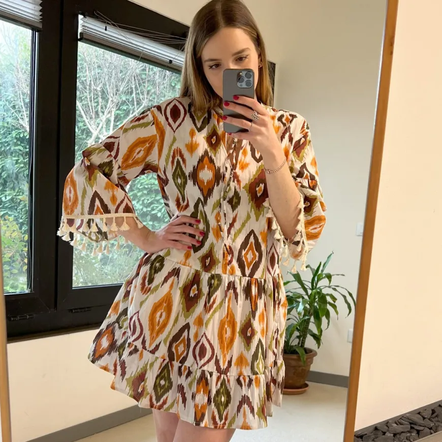 Abito corto di MARKUP, in mussola di cotone, 100%. Realizzato in stampa chiné con gonna a balze. Maniche a sbuffo con nappine e scollo alla coreana con laccio regolabile.
