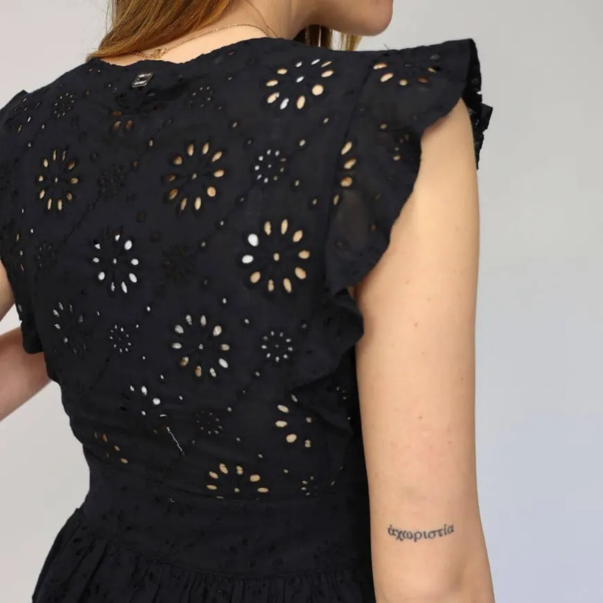 Abito lungo da donna di MARKUP realizzato in sangallo nero con scollo a V e gonna a balze. Sottoveste incorporata. La modella è alta 1.68 cm e veste una S.