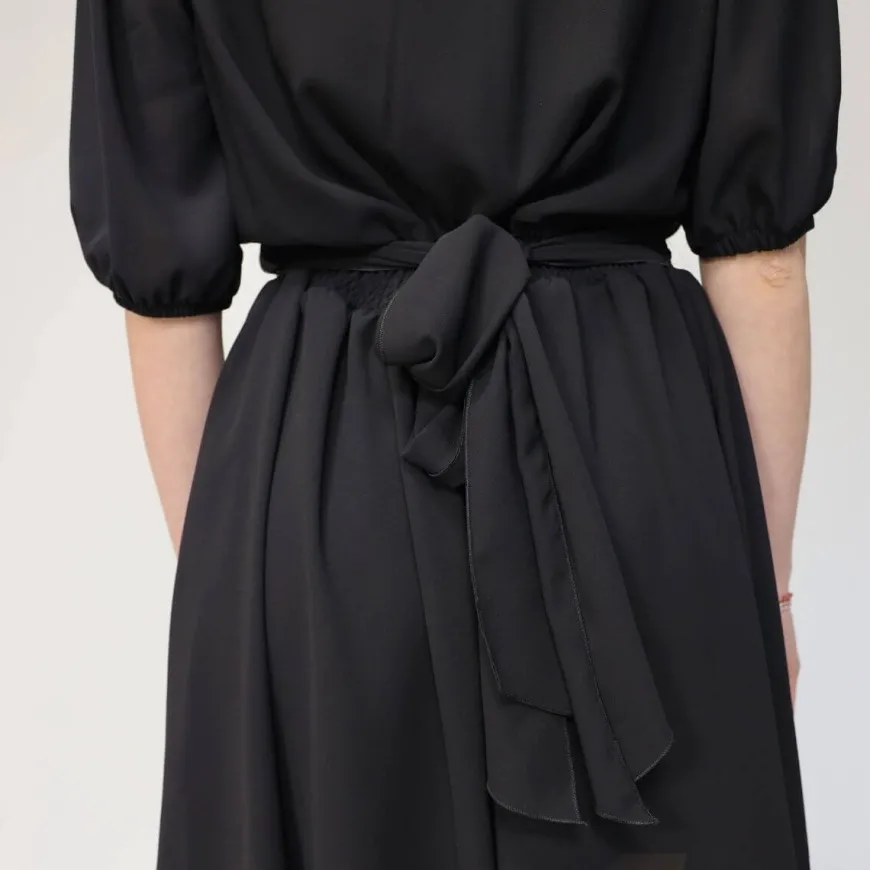 Abito corto da donna di MARKUP realizzato in tessuto nero. Manica tre quarti con arricciatura. Elastico in vita con nastro. La modella è alta 1.68 cm e in dossa una M,