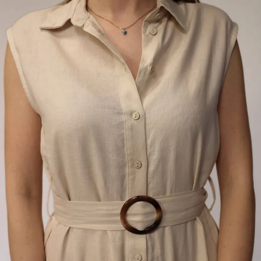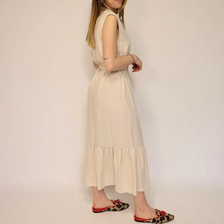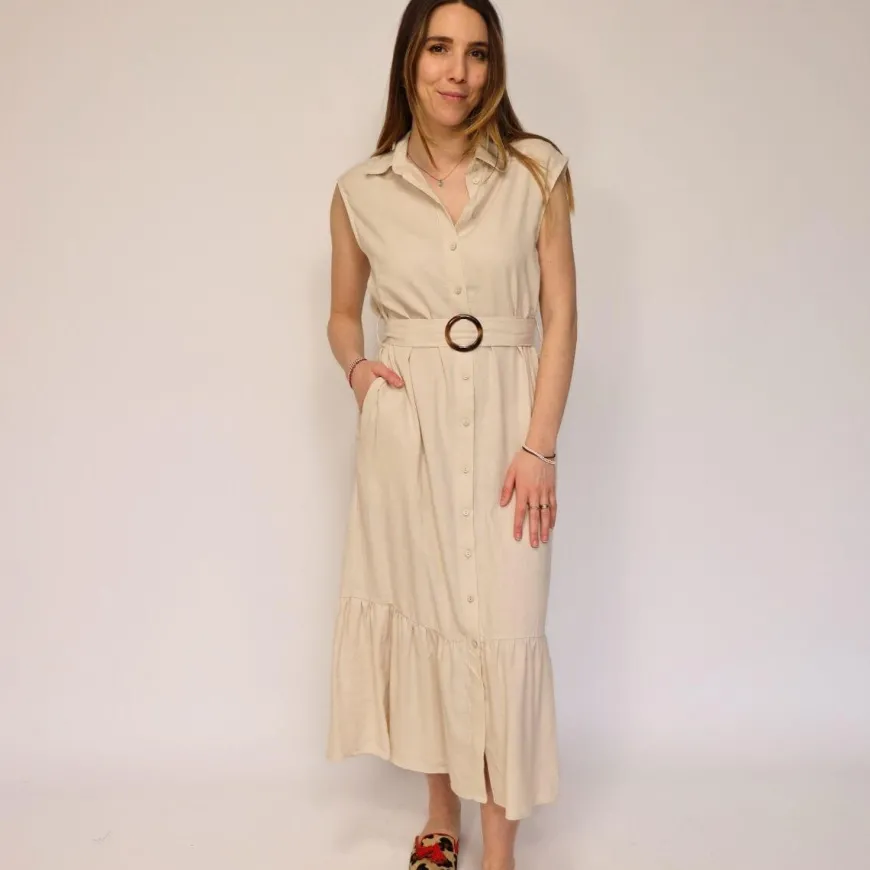 Abito chemisier da donna di MARKUP realizzato in lino beige con bottoni sulla parte frontale e gonna a balze. Cintura in vita regolabile. La modella è alta 1.68 cm e veste una M.