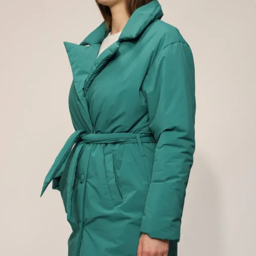 Giubbetto da donna di MARKUP, realizzato in nylon e poliestere verde con cappuccio. Lungo con tasche frontali e chiusura con bottoni.