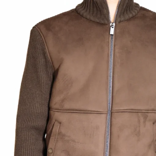 Giubbotto da uomo di MARKUP, realizzato in poliestere nabuk marrone sulla parte frontale e in poliestere effetto maglione color testa di moro sulle maniche e sulla schiena. Interno realizzato acrilico effetto teddy morbido bianco. Chiusura con zip e presenza di tasche frontali.
