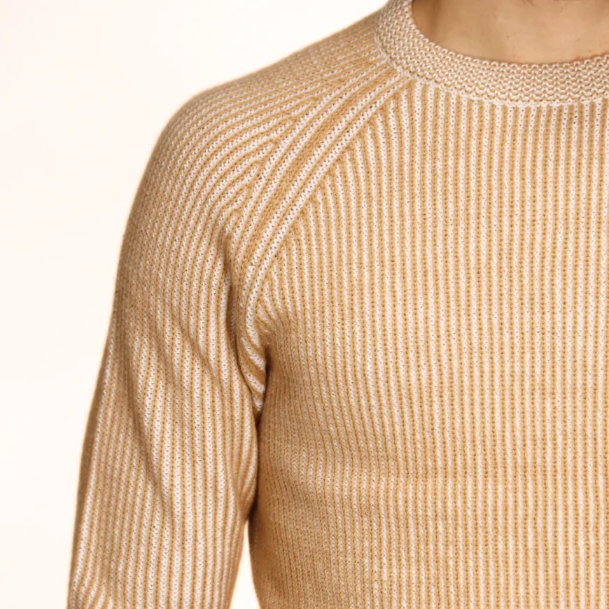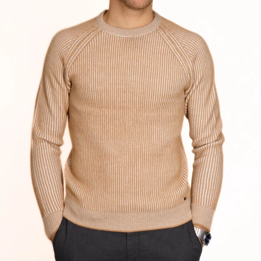 Maglione da uomo di MARKUP in acrilico beige a costine. Giro collo. Il modello indossa una L.