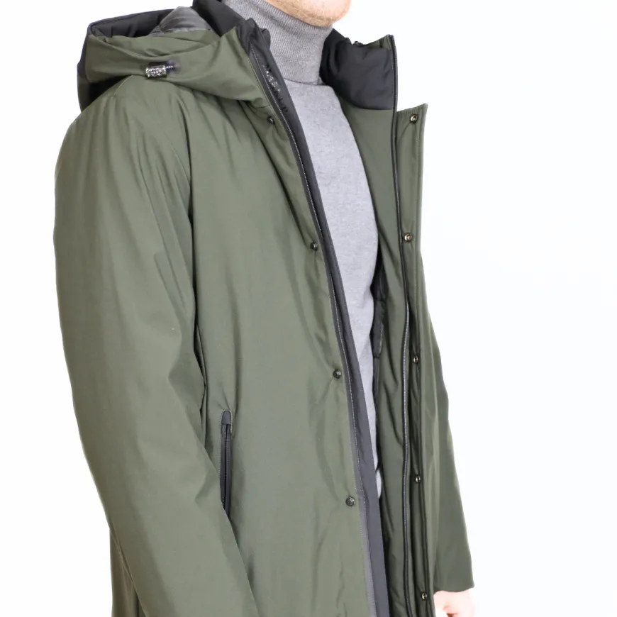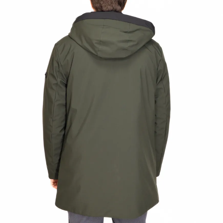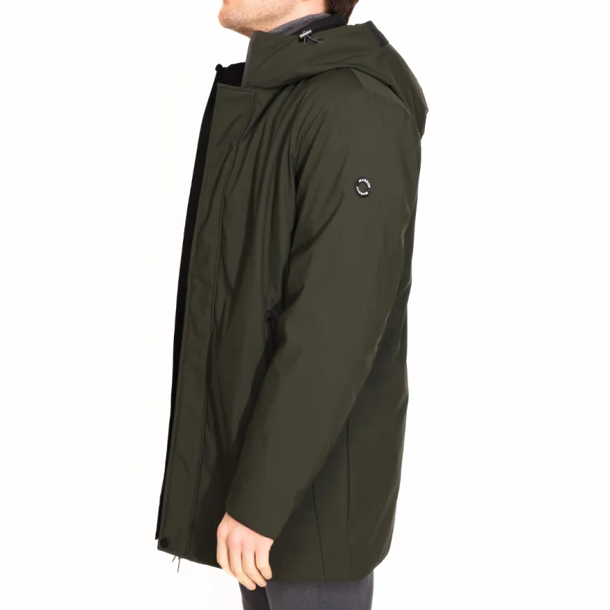 Parka da uomo di MARKUP, realizzato in poliestere color piombo. Lungo con tasche frontali e chiusura con zip. Possibilità di stringere il cappuccio con appositi lacci elastici.