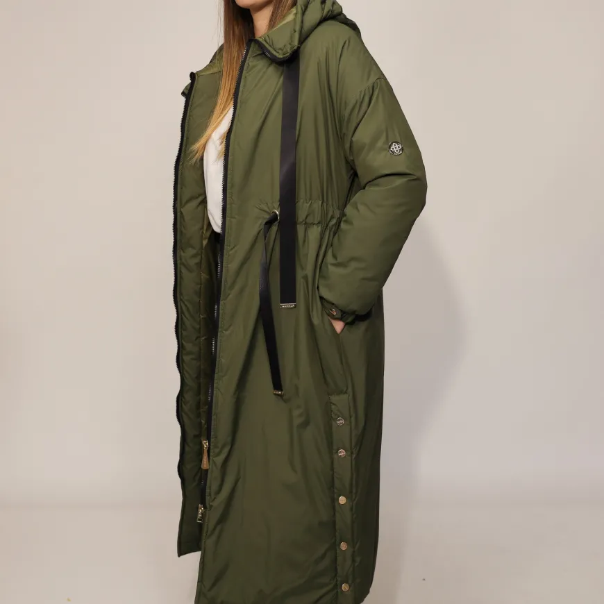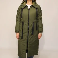 Giubbetto da donna di MARKUP, realizzato in nylon e poliestere verde con cappuccio. Lungo con tasche frontali e chiusura con zip. Possibilità di essere stretto in vita tramite appositi lacci e di essere aperto ai lati tramite dei bottoni.