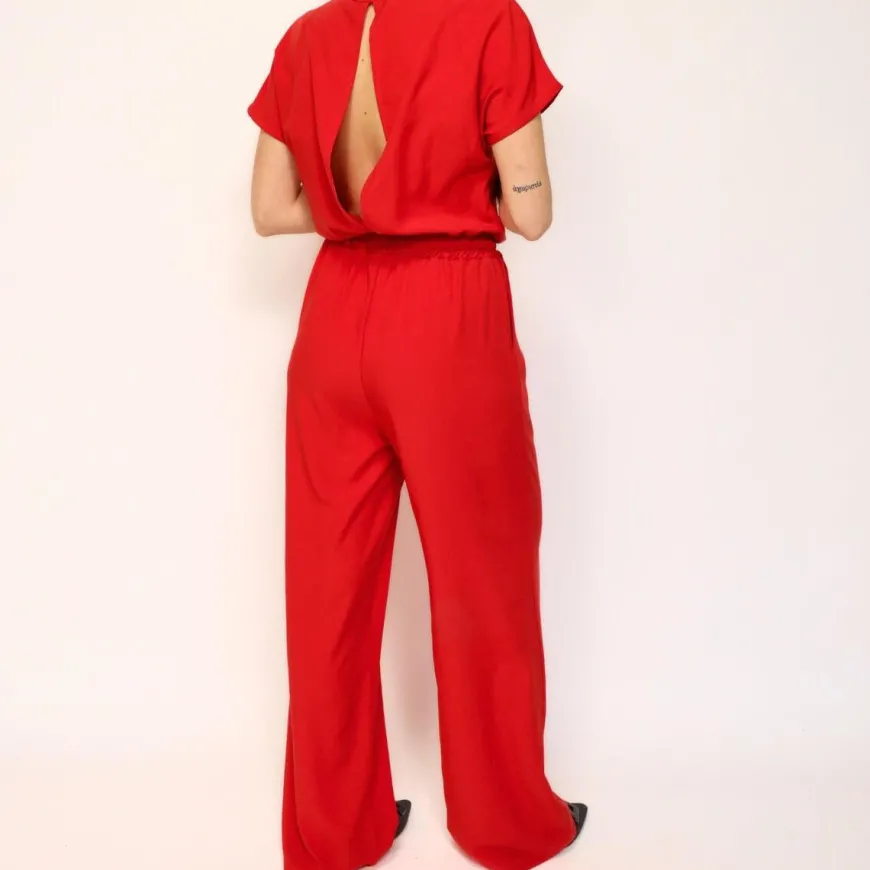 Tuta da donna mezza manica di MARKUP realizzato in tessuto rosso con arricciatura in vita e couliss. La modella è alta 1.68cm e indossa una S.