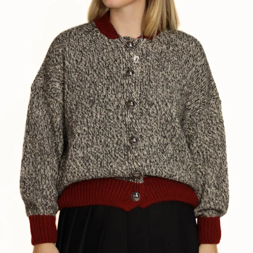 Cardigan da donna di MARYLEY realizzata in tessuto effetto lana grigio e bianco. Chiusura con bottoni argento e scritta ricamata “New York” sulla schiena.