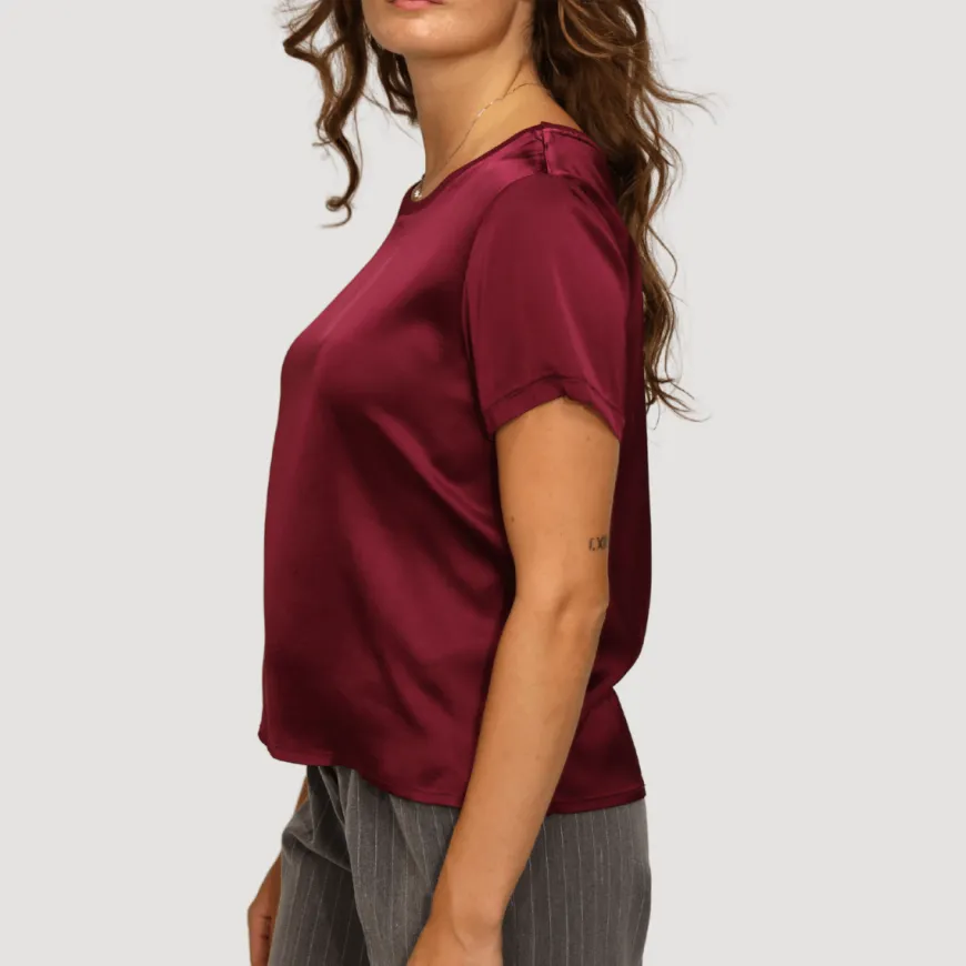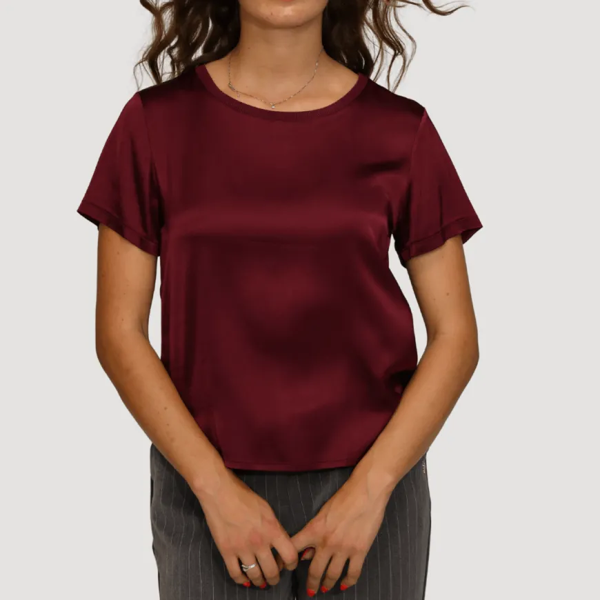Maglia sottogiacca di MARYLEY realizzata in viscosa bordò con mezza manica e giro collo. La modella indossa una S.