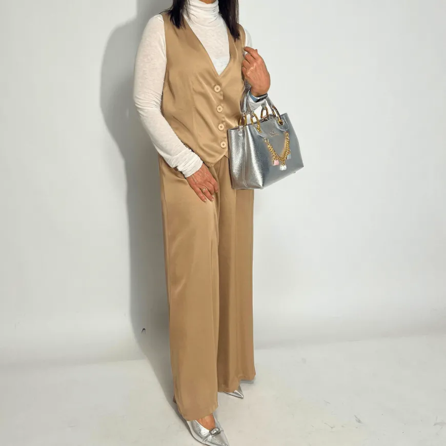 Pantalone di MARYLEY realizzato al 100% in viscosa. Dotato di elastico in vita, sul retro e pinces sulla gamba. Modello a palazzo, vestibilità comoda. Abbinabile a gilet e kimono.