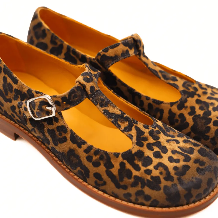 Ballerina modello bebè di MAT20 realizzata in crosta di camoscio fantasia animalier, con chiusura regolabile. Interno e sottopiede, non estraibile, foderati in pelle. Suola in cuoio.