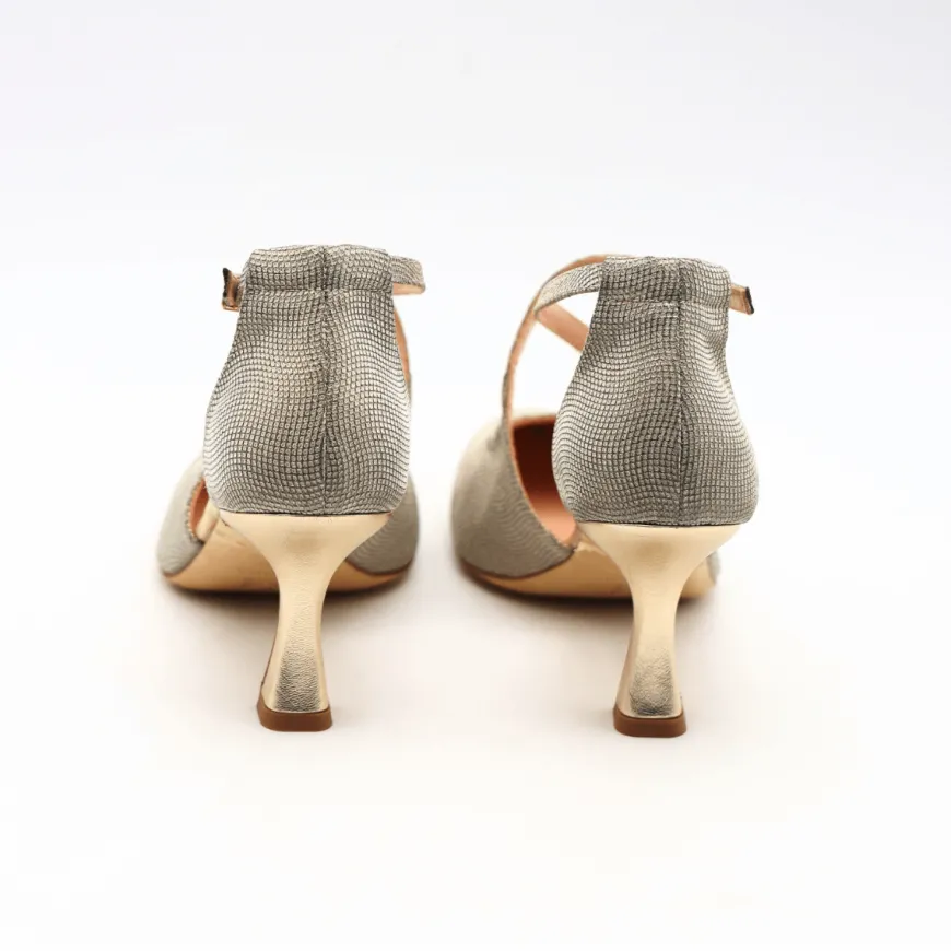 Decollete di MELLUSO. Queste eleganti scarpe realizzate in pelle glitterata platino sono dotate di un comodo interno e soletta in morbida pelle, con cinturino regolabile. Un design sofisticato con una suola in effetto cuoio.