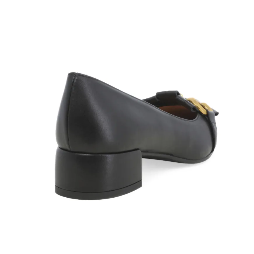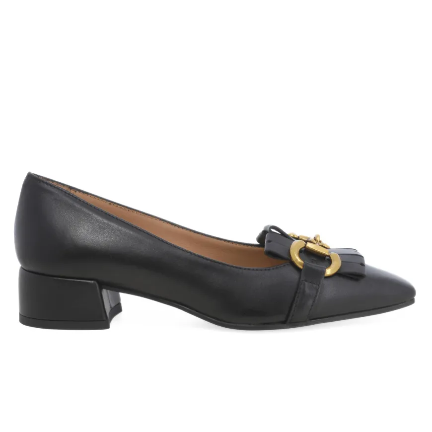 Decollete basso di MELLUSO. Queste eleganti scarpe realizzate in pelle color nero con morsetto e frange sulla tomaia. Interno e sottopiede foderati in pelle. Suola in gomma.