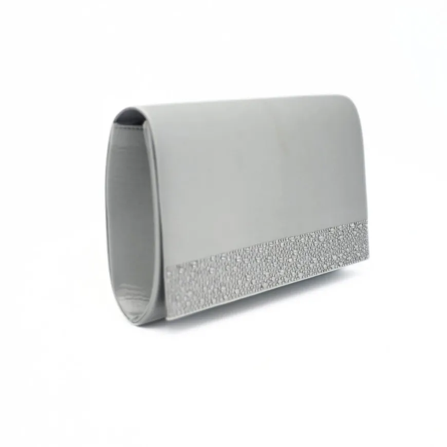 Pochette elegante da donna di MELLUSO realizzata in raso argento con strass. Interno unico scomparto. Chiusura con bottone a calamita. Tracollina in catena.