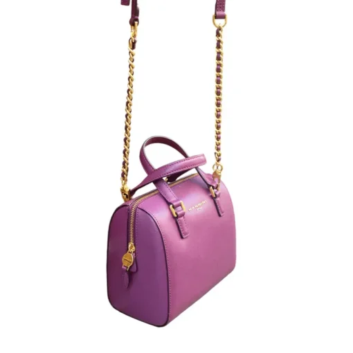 Bauletto da donna di NANNINI, della linea FLORA, realizzato in pelle effetto saffiano viola. Interno unico comparto con tasche accessorie. Doppio manico e tracolla con inserti in catena removibile. Chiusura con zip.