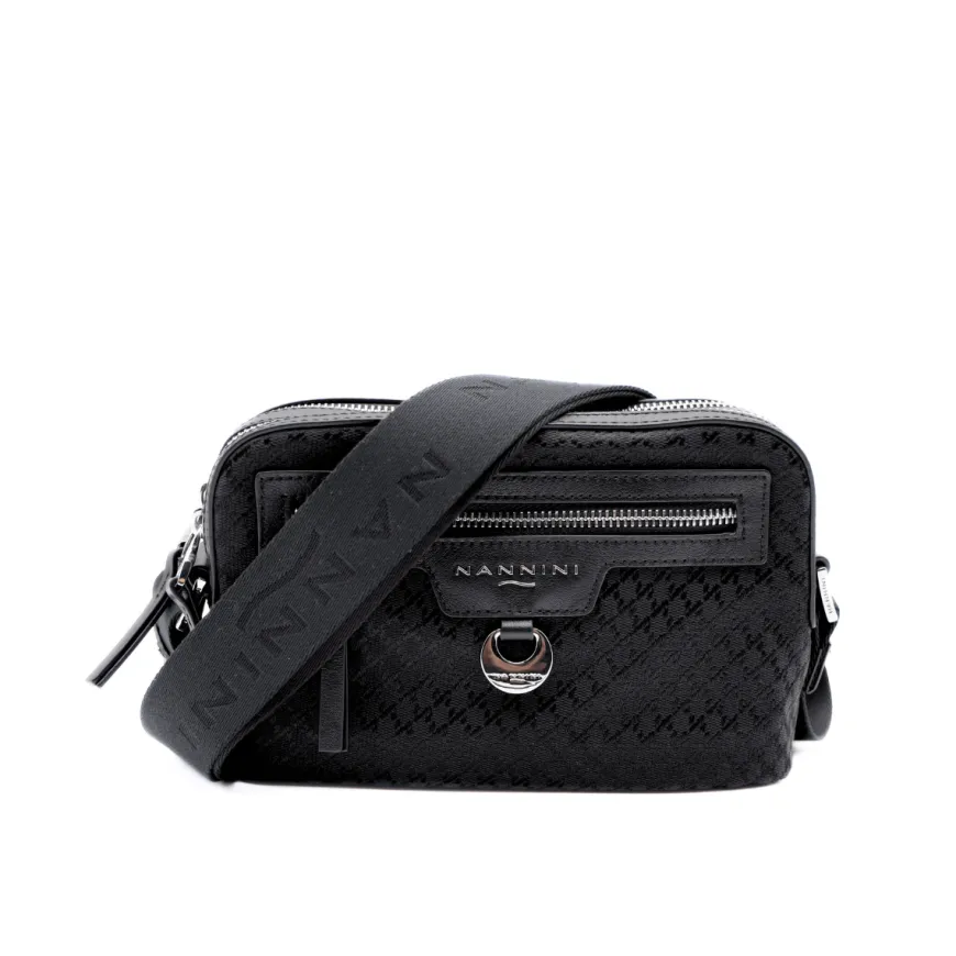 Borsa a spalla da donna di NANNINI, realizzata in tessuto tramato con tasca frontale. Doppio comparto con tasche accessorie. Tracolla in tessuto regolabile. Chiusura con doppia zip.