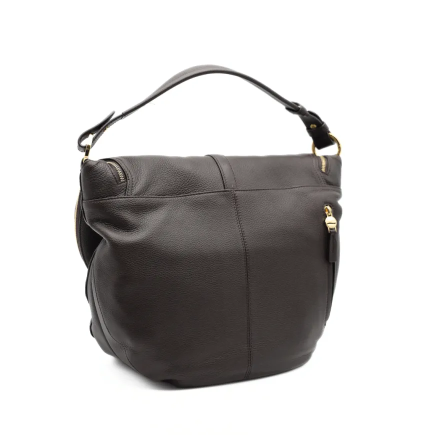 Borsa a spalla da donna di NANNINI realizzata in pelle testa di moro con patta grande con tasca. Interno unico comparto con tasche accessorie. Manico in pelle.