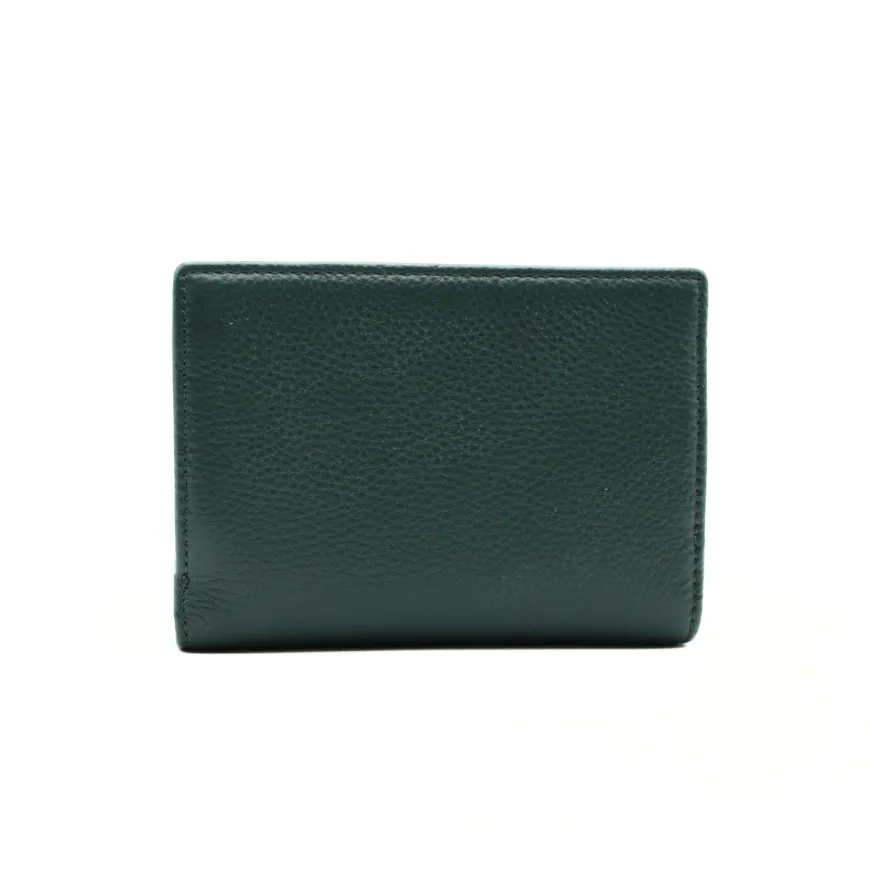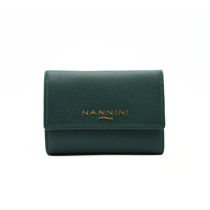 Portafoglio da donna di NANNINI, realizzato in morbida pelle bottalata verde. Dotato di cerniera esterna con scomparto portamonete e chiusura con bottoncino a pressione. Presenta una regolare apertura per banconote e inserti portacarte.