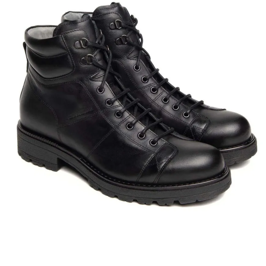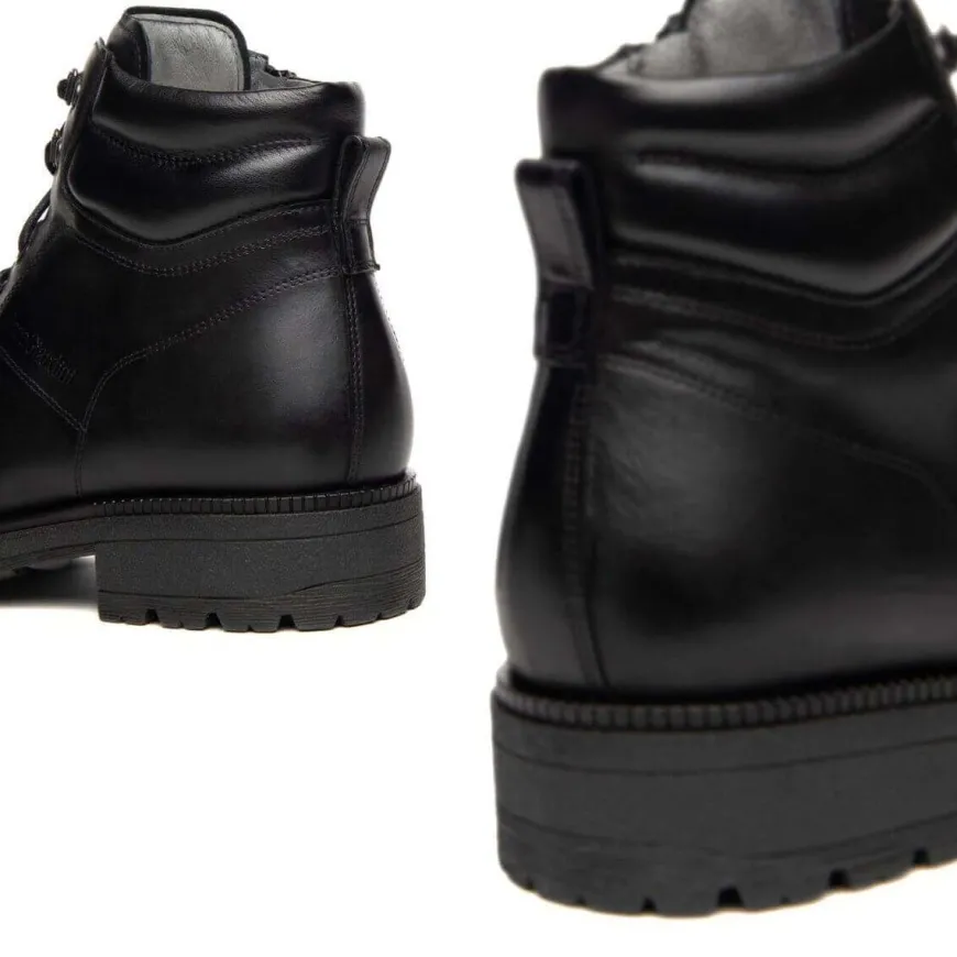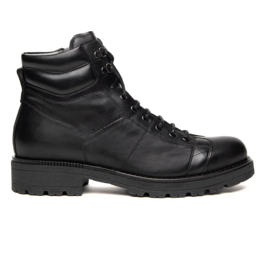 Anfibio di Nero Giardini, personalità e stile unico. Realizzato in pelle color nero con gancetti e chiusura con zip unilaterale. Interno e sottopiede, estraibile, in pelle. Suola in gomma carrarmato.