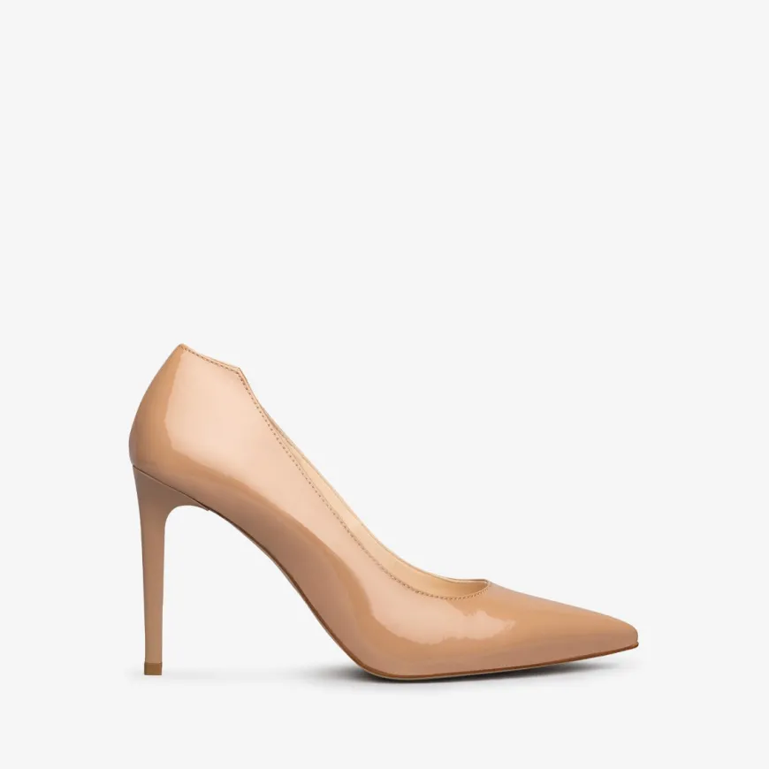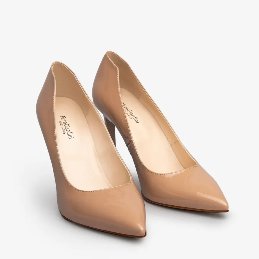 Elegante décolleté donna di NERO GIARDINI. Tomaia realizzata in pelle nude verniciata. Interno e sottopiede foderati in pelle. Suola in gomma con inserto antiscivolo.