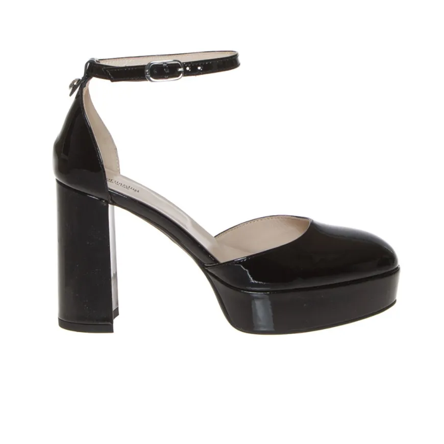 Dècolletè donna di NERO GIARDINI. Tomaia realizzata in pelle naplack nera. Interno e sottopiede foderati in pelle. Chiusura con cinturino alla caviglia regolabile. Suola, con zeppa, in gomma e tacco rivestito.
