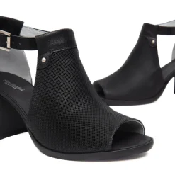 Sandalo in pelle nera microforata di NERO GIARDINI. Unica fascia e cinturino di chiusura regolabile. Internamente morbido soffietto nel sottopiede rifinito in pelle. Suola in gomma antiscivolo, tacco largo rivestito 7 cm. Calzatura con vestibilità comoda; ideata, disegnata e realizzata in Italia, prodotto made in Italy.