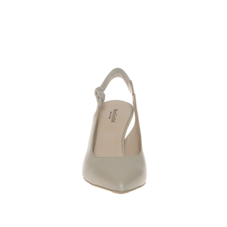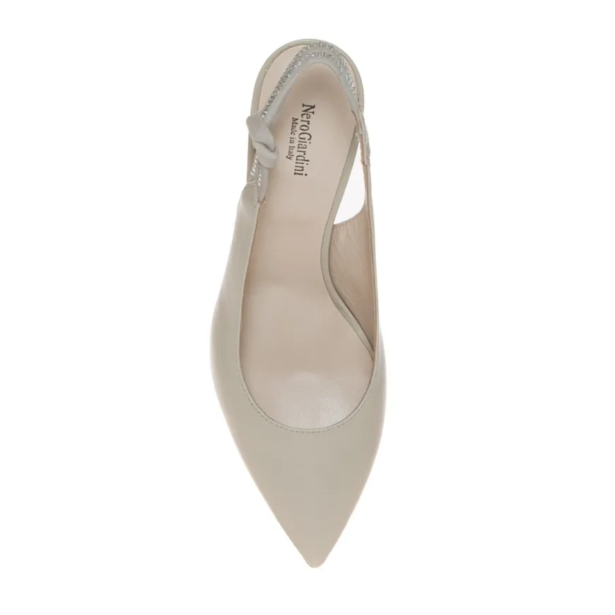 Slingback donna di NERO GIARDINI. Tomaia realizzata in pelle beige con cinturino elasticizzato. Interno e sottopiede foderati in pelle. Suola in gomma con inserto antiscivolo.