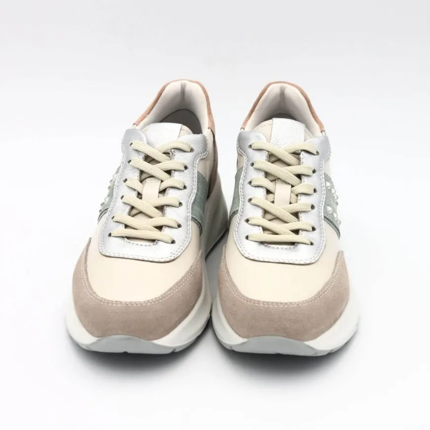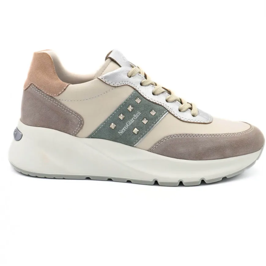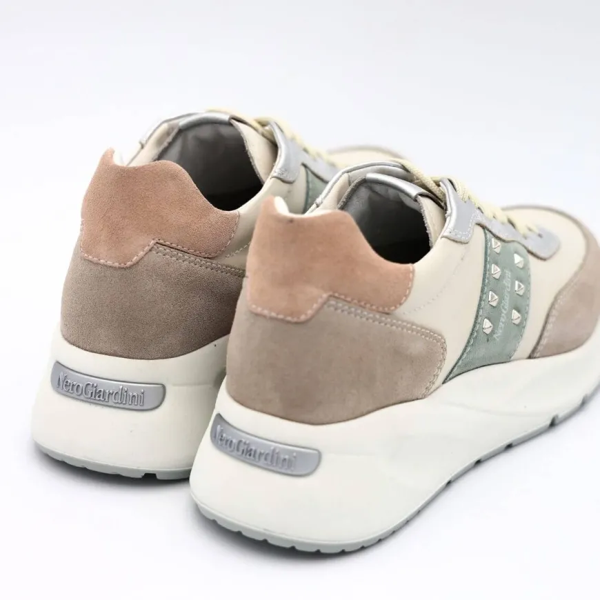 Aggiungi un tocco di eleganza al tuo look con le sneakers da donna di Nero Giardini. Realizzate in pelle bianca con inserti in camoscio multicolore e borchie, queste sneakers offrono un comfort supremo grazie all’interno e al sottopiede in pelle estraibile. La suola in gomma platform di 5cm è perfetta per camminare con stile.