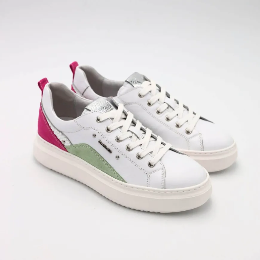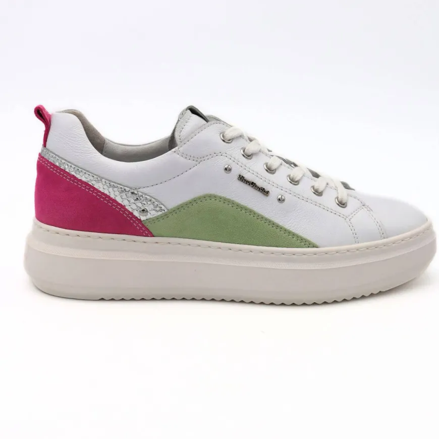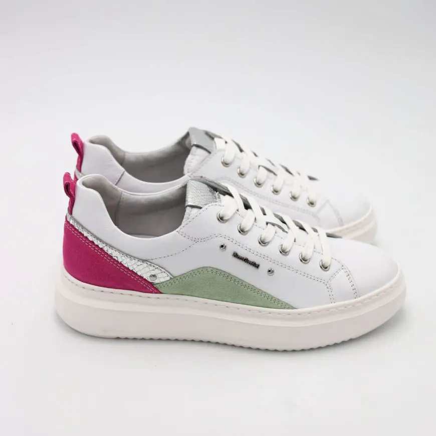 Sneakers da donna di Nero Giardini, tomaia realizzata in pelle bianca, con tallone con inserti in camoscio multicolore. Chiusura con lacci. Interno e sottopiede estraibile in pelle. Suola in gomma platform.