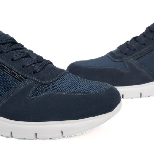 Sneaker da uomo di NERO GIARDINI. realizzata in camoscio blu con inserti in mesh e tallone grigio. Interno e sottopiede, estraibile, foderati in pelle. Chiusura con laccio e cerniera per un maggiore confort. Suola in gomma.