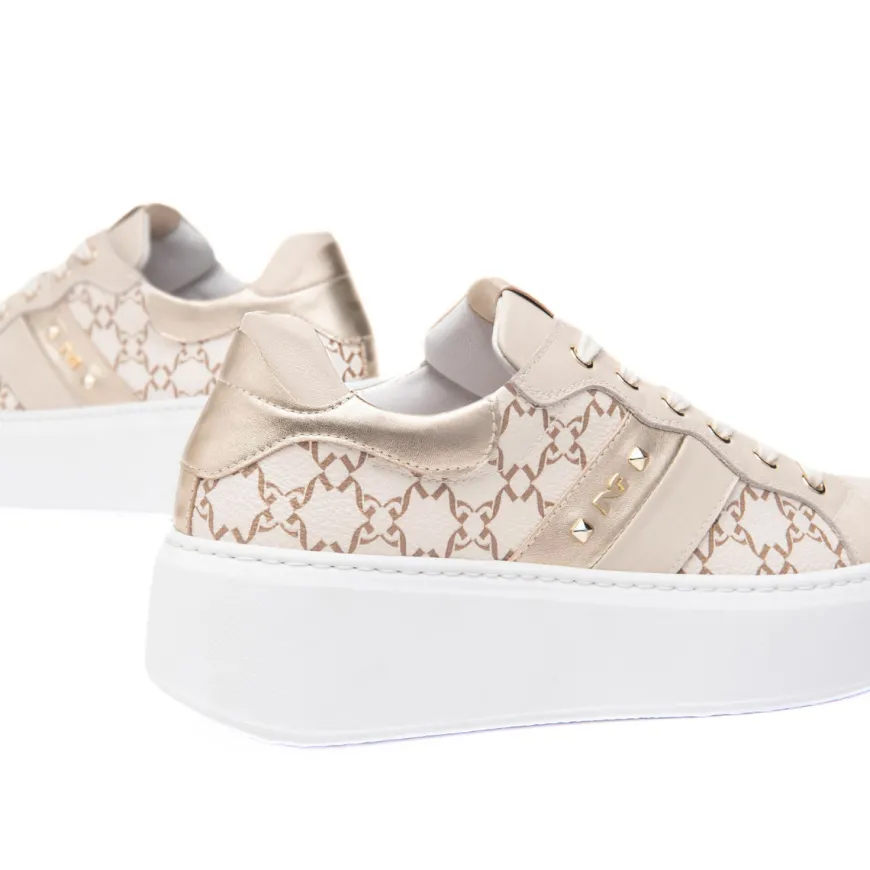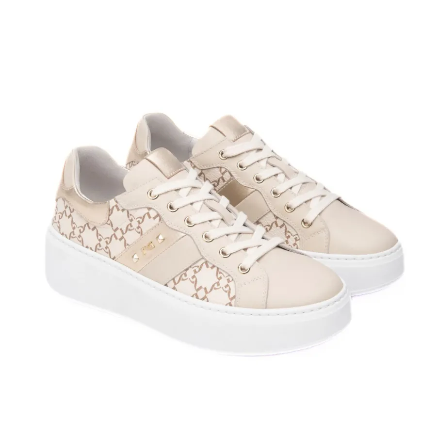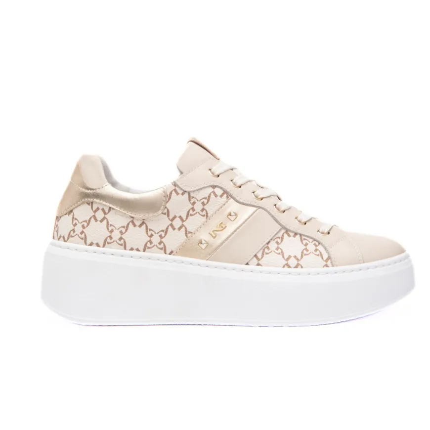 Sneakers da donna di Nero Giardini, tomaia realizzata in pelle loggata beige, inserti in pelle oro e beige. Chiusura con lacci. Interno e sottopiede estraibile in pelle. Suola in gomma platform.