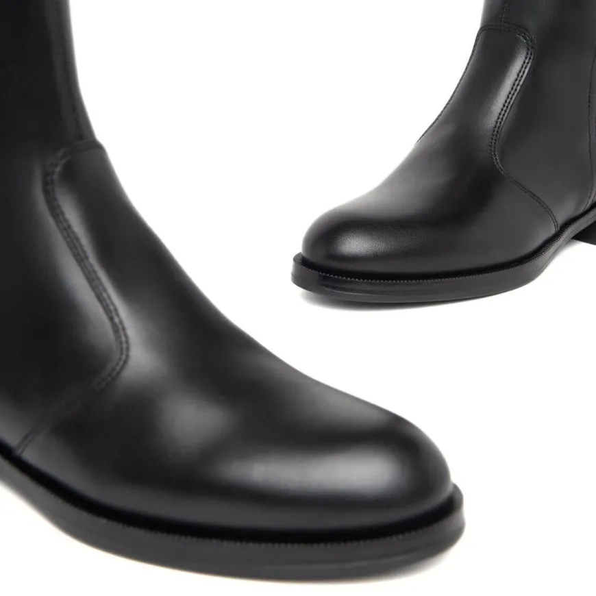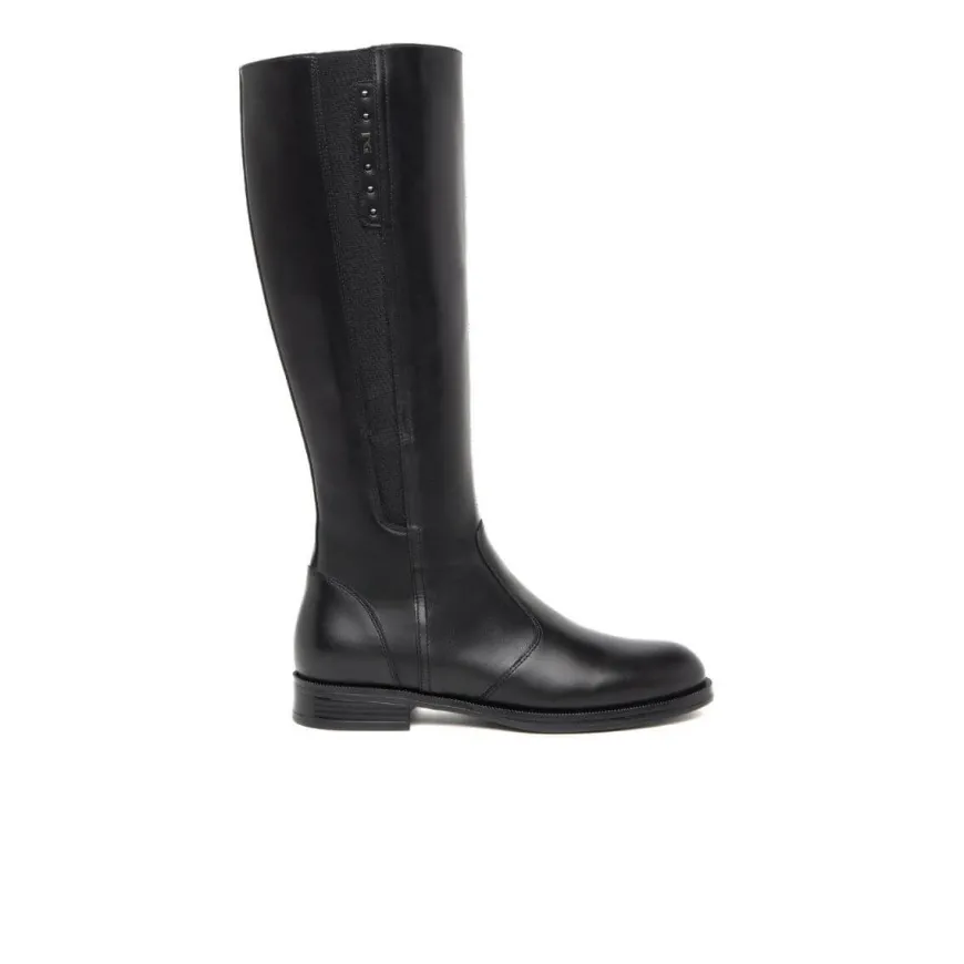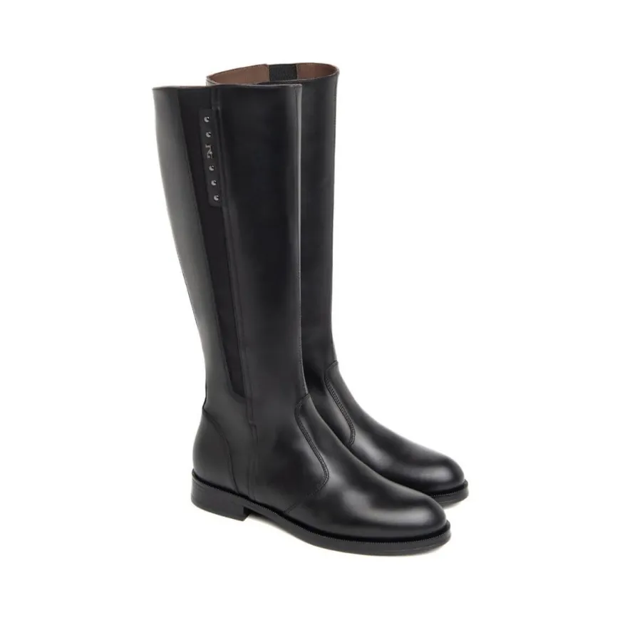 Stivale da donna di NERO GIARDINI in pelle nera, con elastico e logo unilaterale. Interno foderato in pelle con morbido sottopiede non estraibile. Chiusura con zip laterale. Suola in gomma.