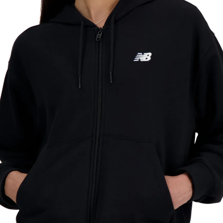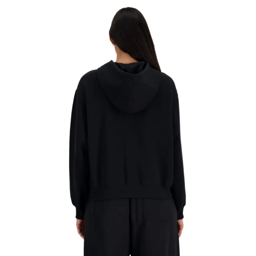 Felpa da donna di NEW BALANCE realizzata in cotone nero con logo ricamato. Interno felpato. Chiusura con cerniera e cappuccio.